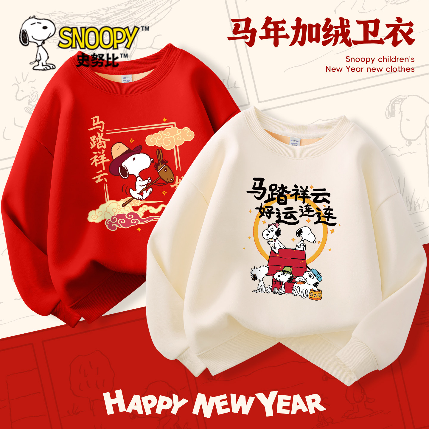 史努比男童拜年服红色本命年加绒卫衣冬季一体绒儿童喜庆过年衣服