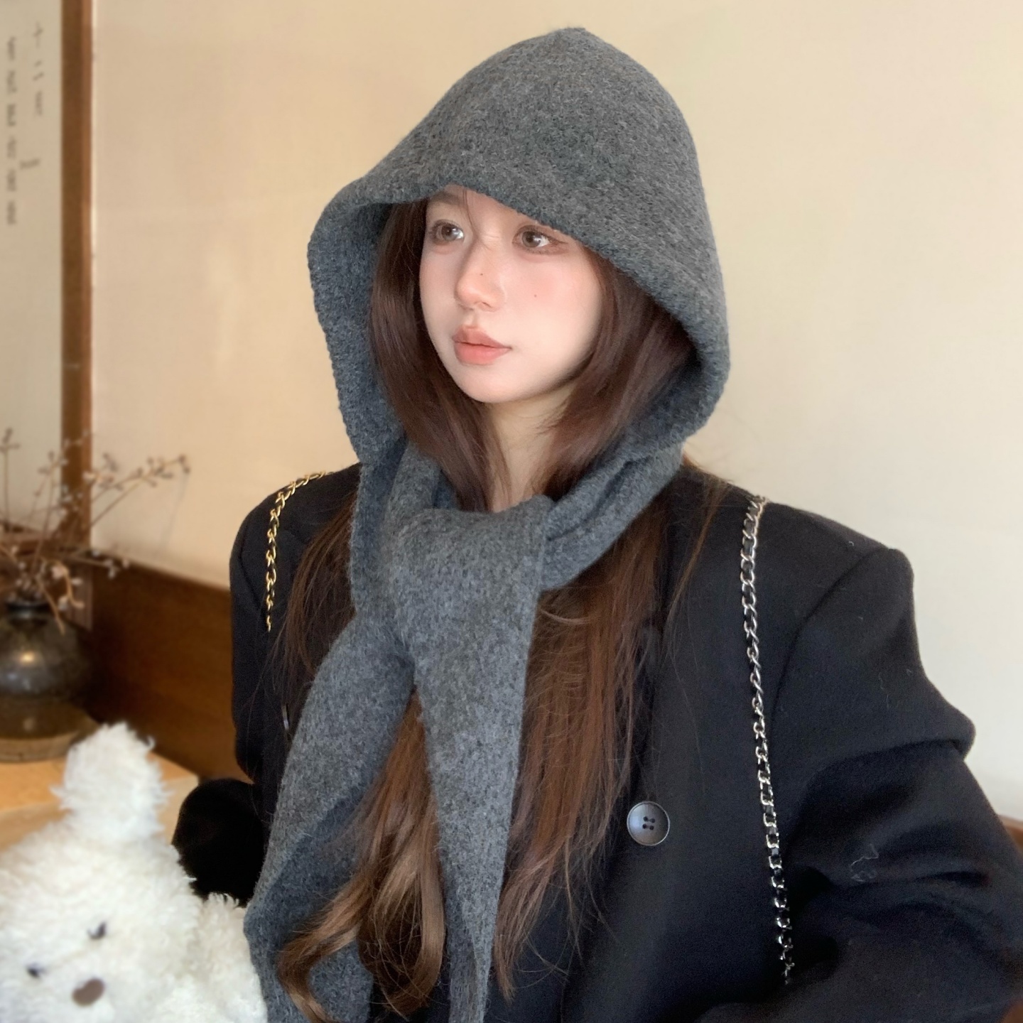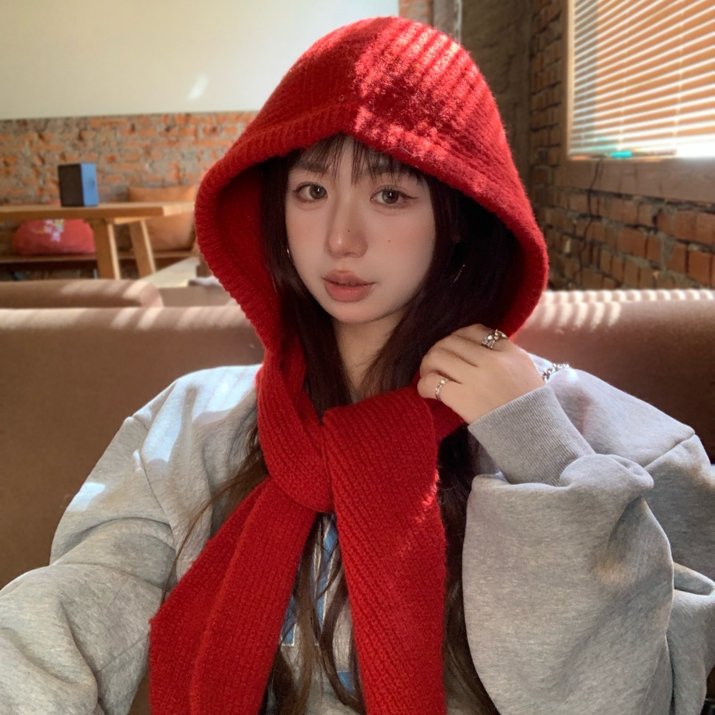 红色羊毛针织帽女秋冬加厚保暖护耳毛线帽子围巾一体巴拉克拉法帽