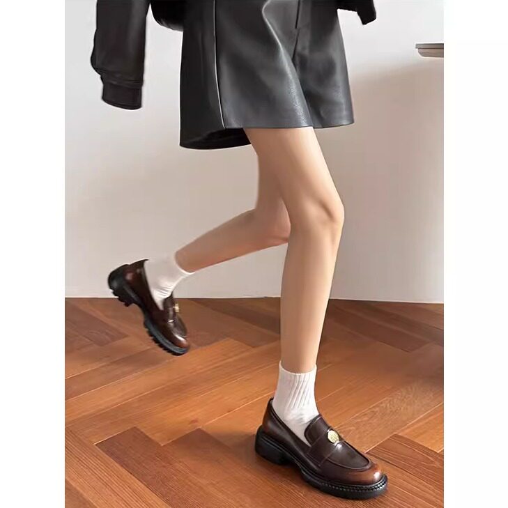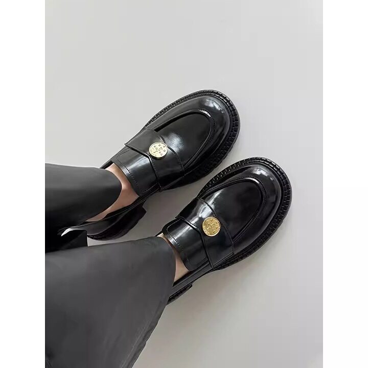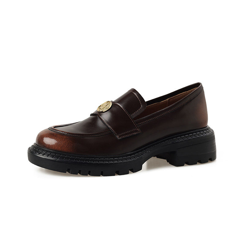 真皮法式复古美拉德风百搭英伦风小皮鞋宽头金币乐福鞋厚底单鞋女