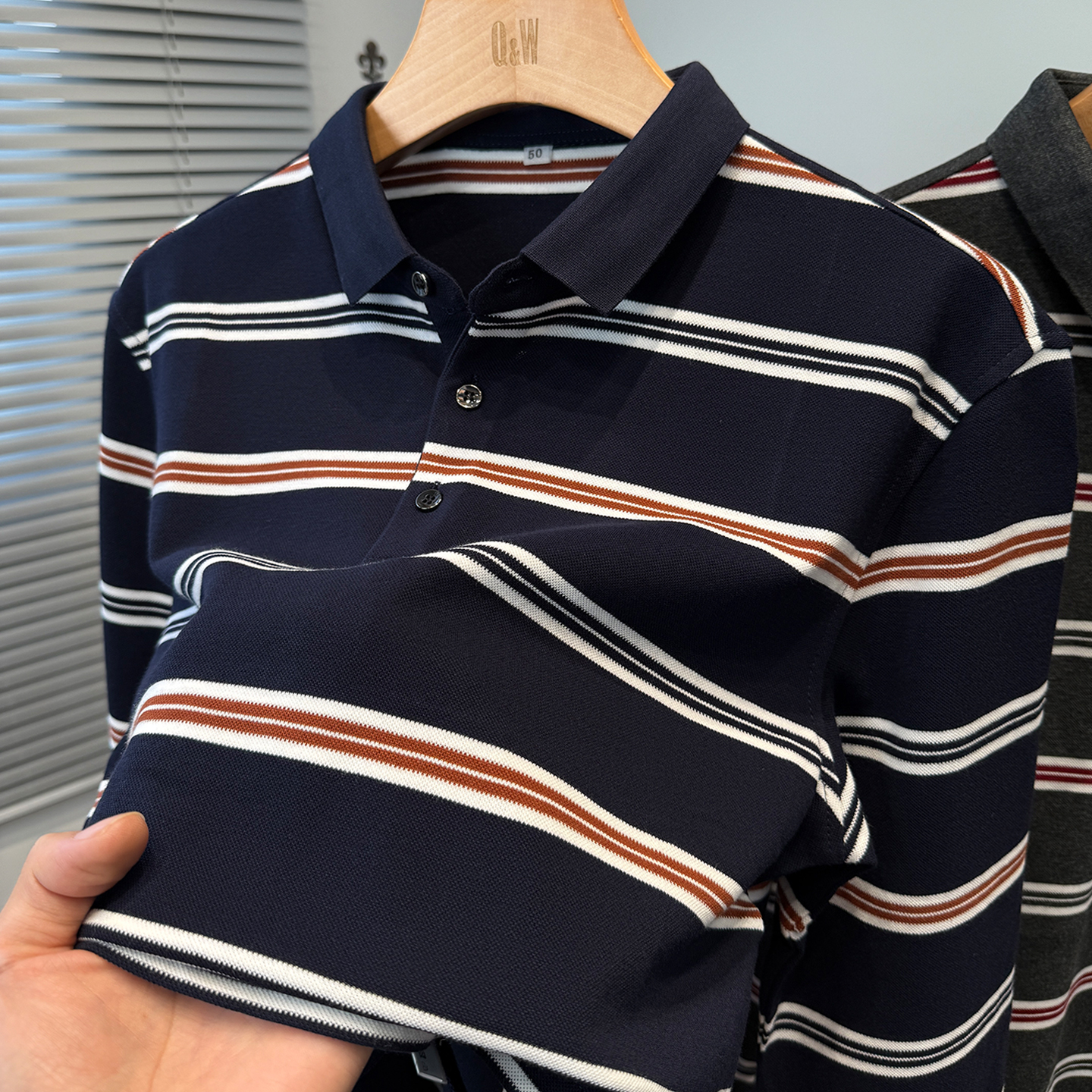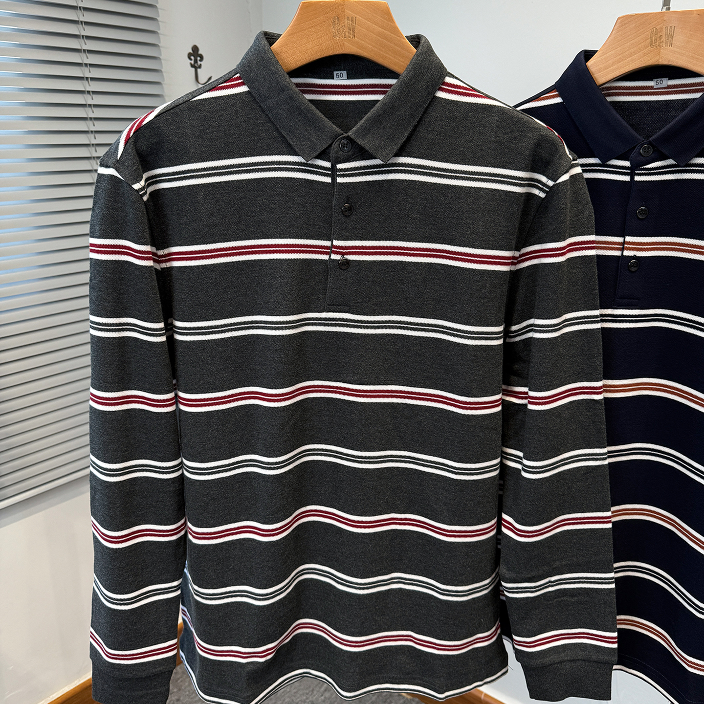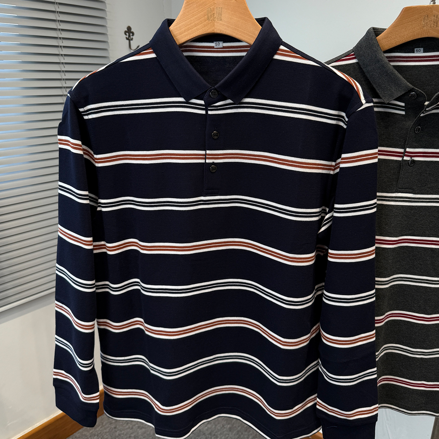 高级感条纹纯棉t恤男长袖翻领运动休闲polo衫男装秋季新款上衣服