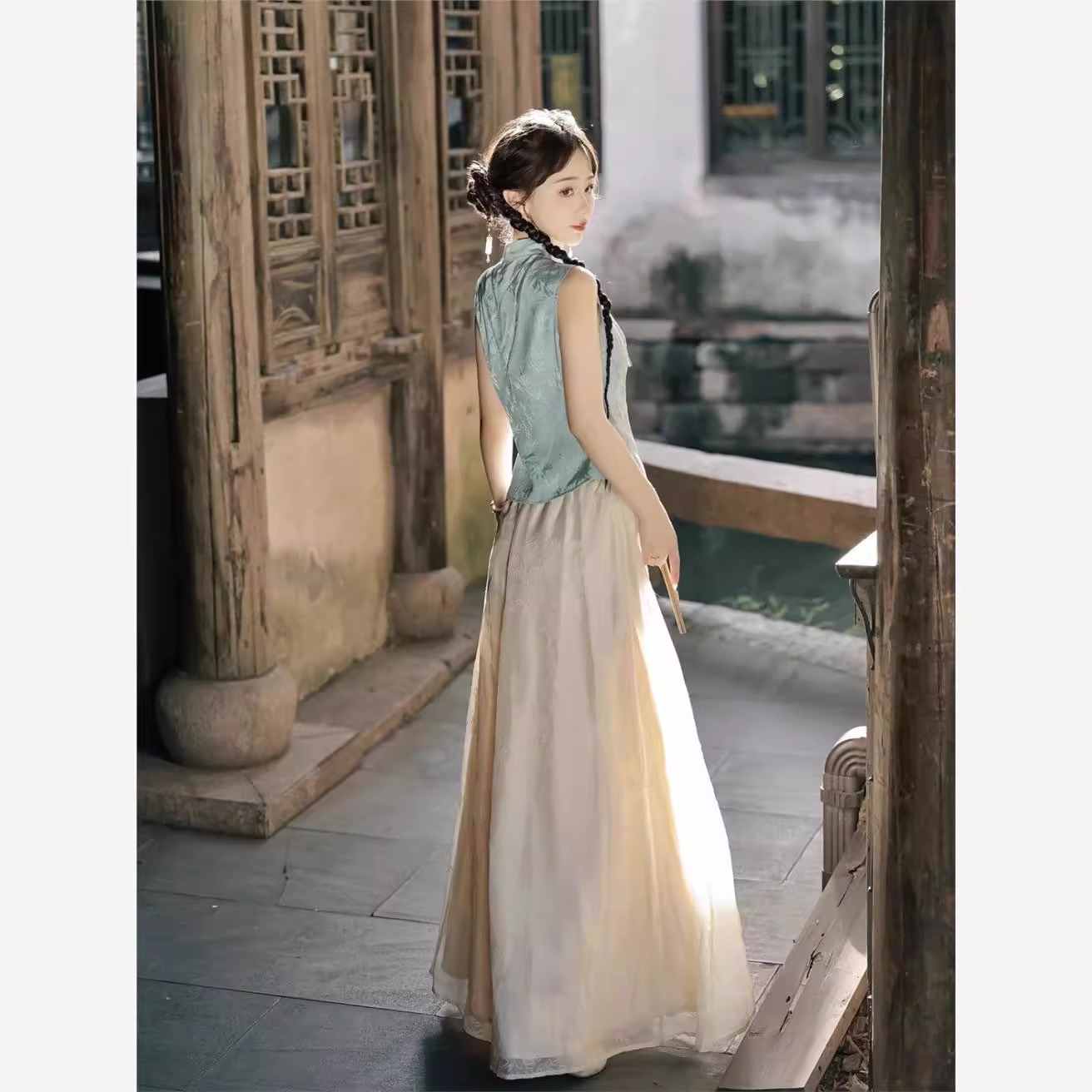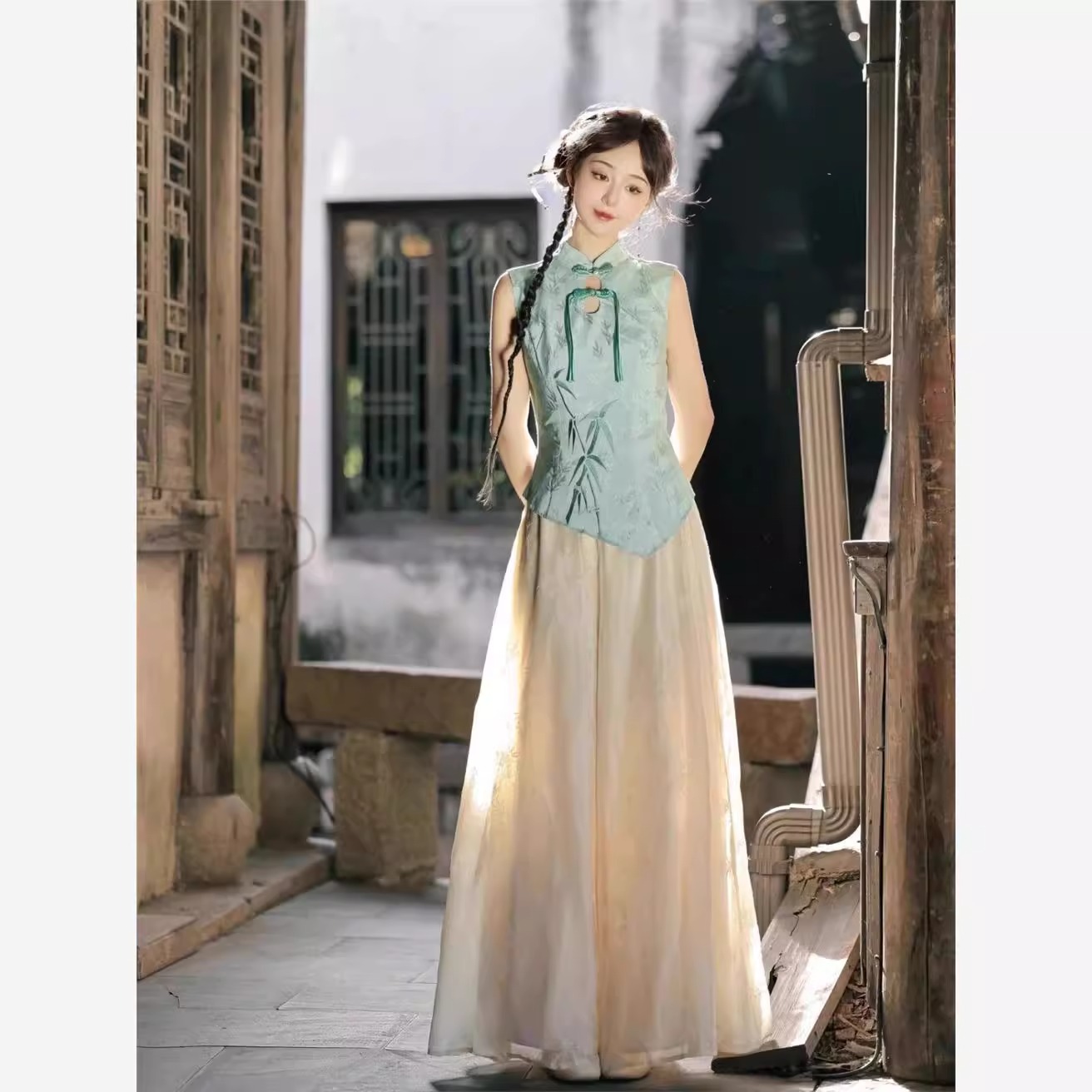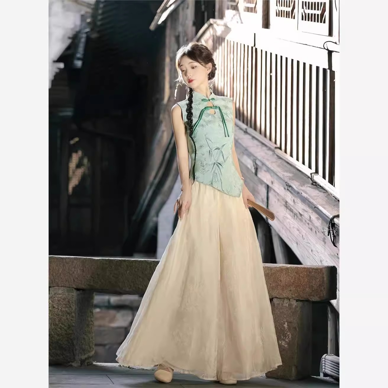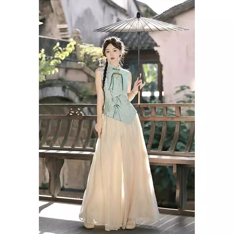 温柔复古制服套装女夏季新中式国风盘扣改良旗袍高腰阔腿裤两件套
