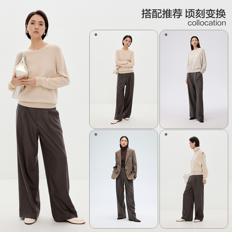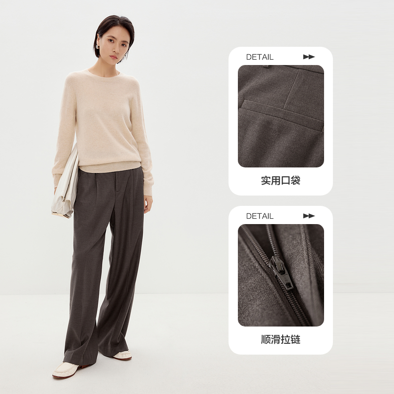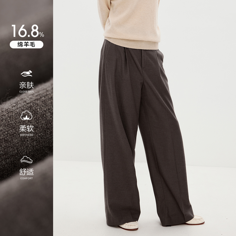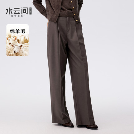 水云间咖色毛呢阔腿直筒休闲长裤女西装裤老钱流光智性风2025新款