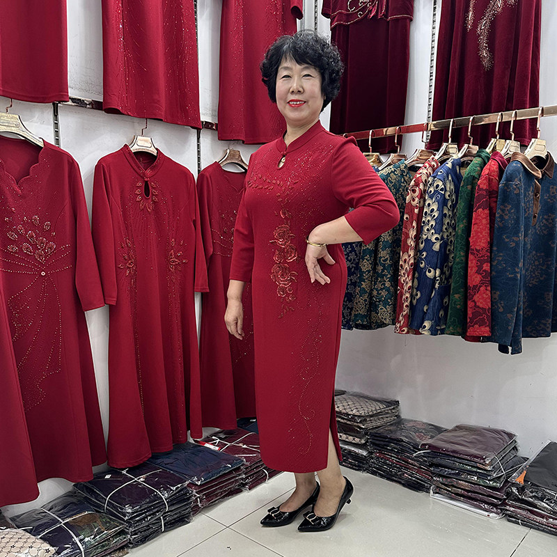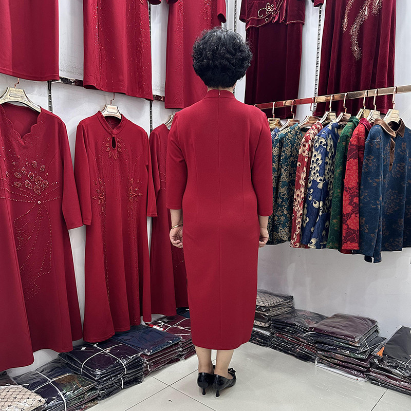 高档立领旗袍式收腰妈妈连衣裙女2023喜庆结婚婆婆婚宴红色礼服新