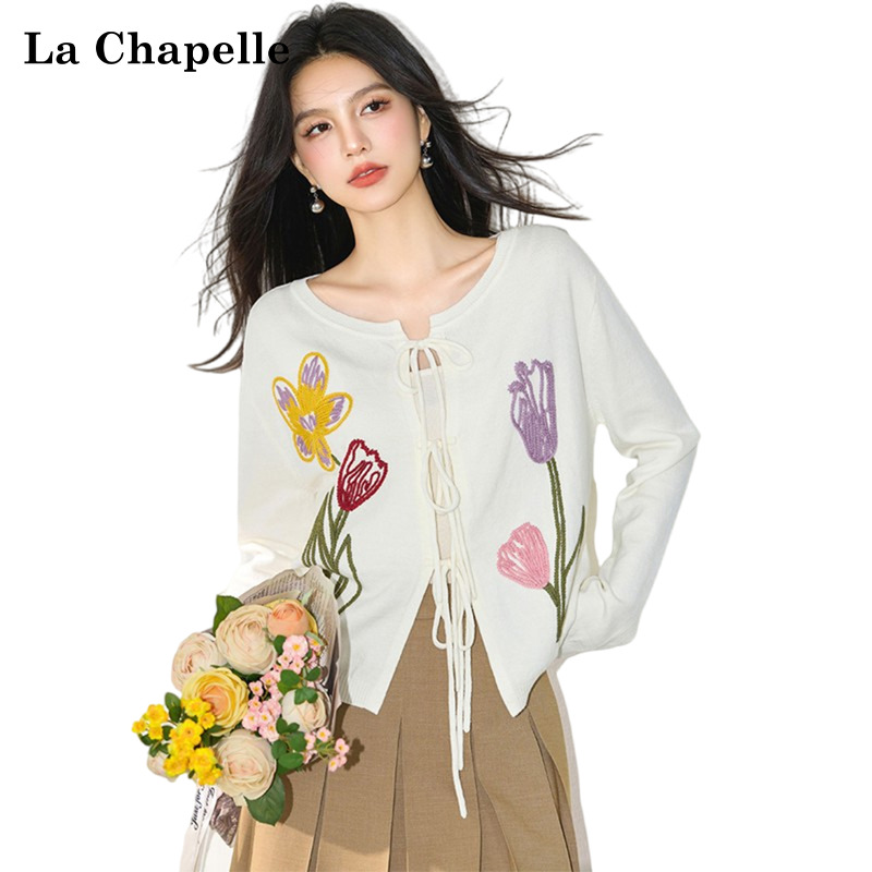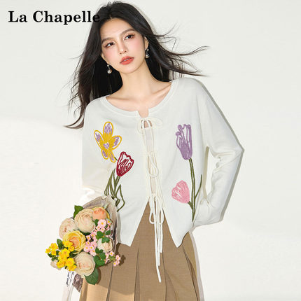 拉夏贝尔韩版白色系带开衫女秋季新款彩色花朵刺绣针织上衣外套