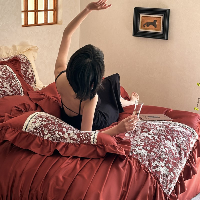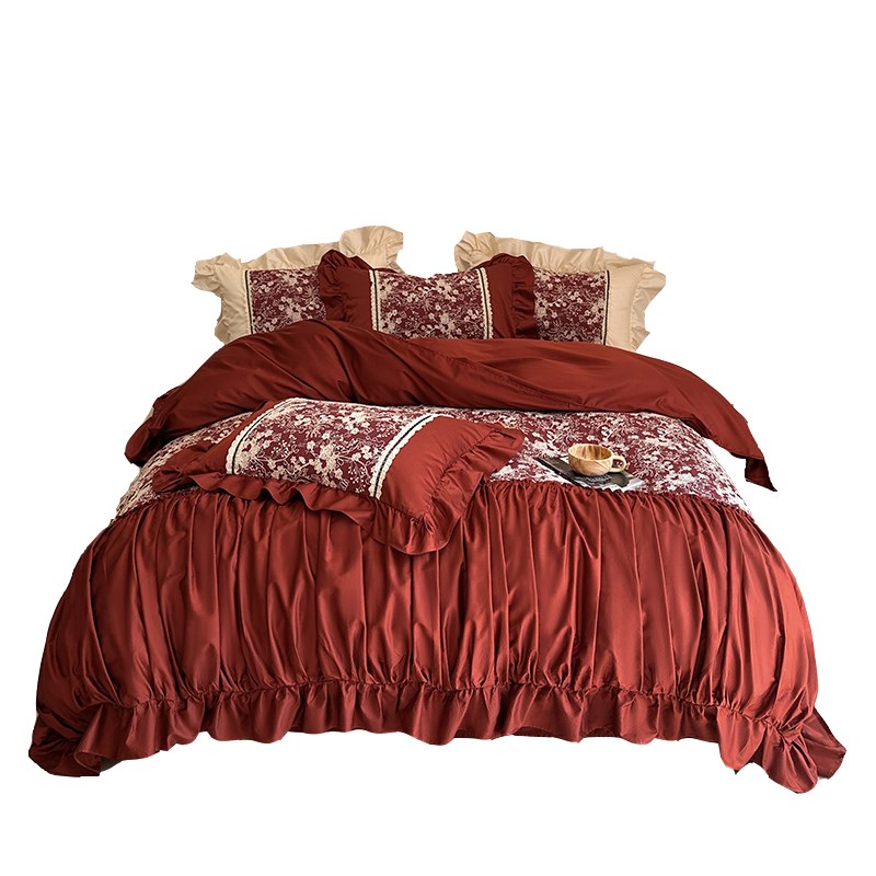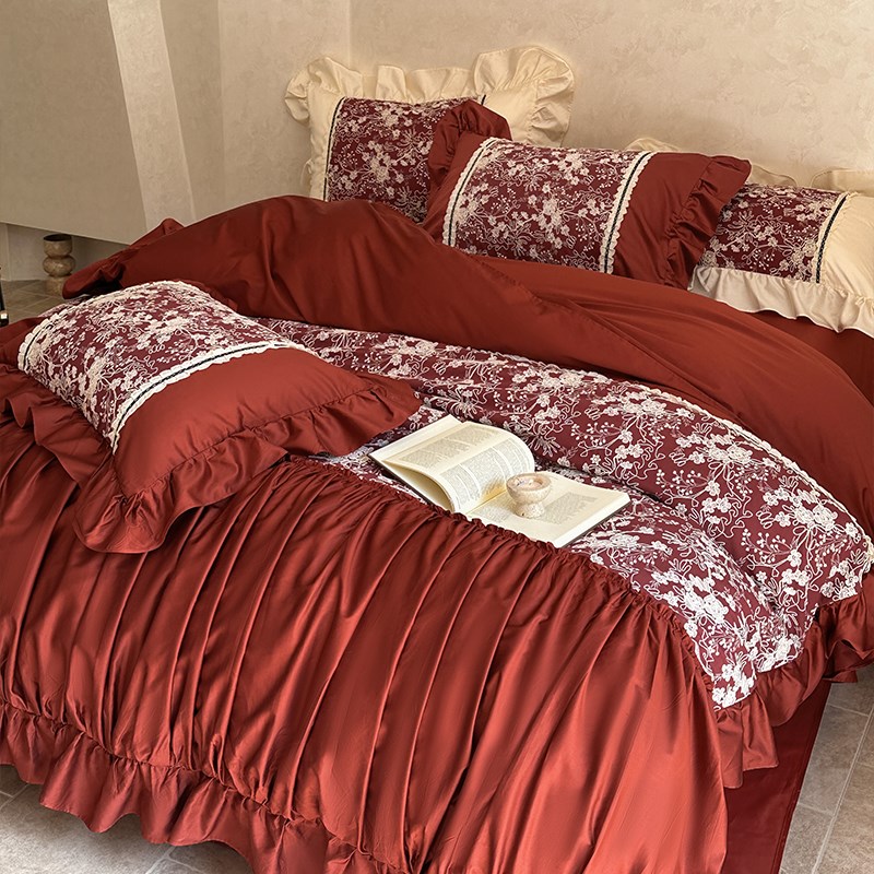 法式浪漫结婚四件套100S长绒棉刺绣红色婚庆被套床单高级床上用品