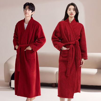 情侣睡袍女珊瑚绒长款睡衣红色本命年加厚法兰绒男士浴袍家居服