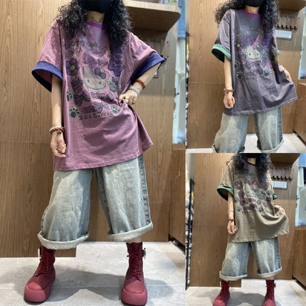 2025夏季新款复古做旧印花圆领短袖T恤女宽松显瘦百搭拼接上衣