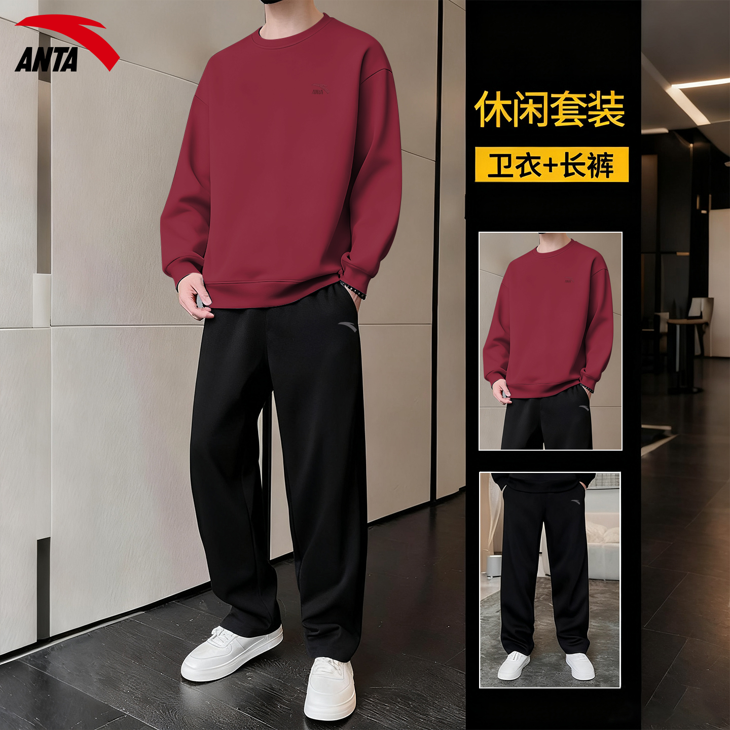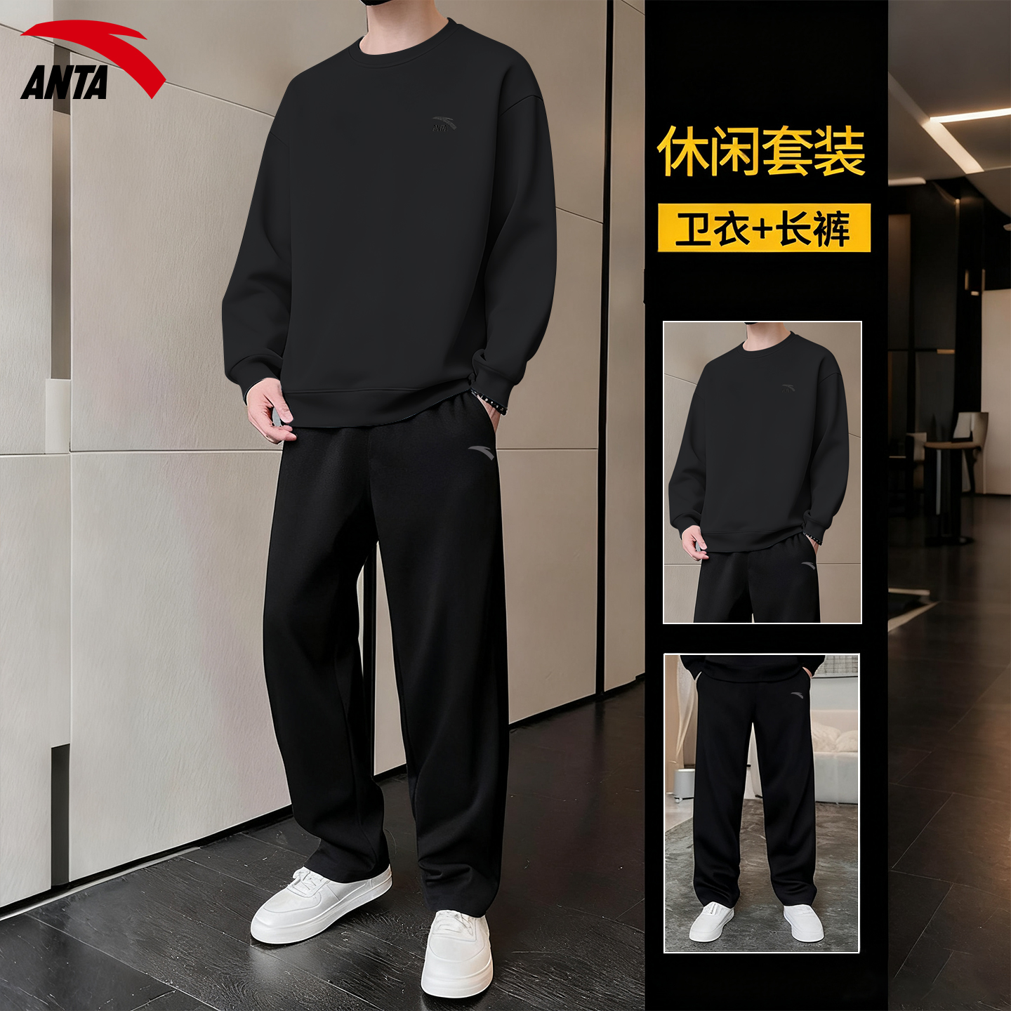 安踏运动套装男款秋冬2025新款圆领潮流宽松休闲长袖阔腿裤两件套