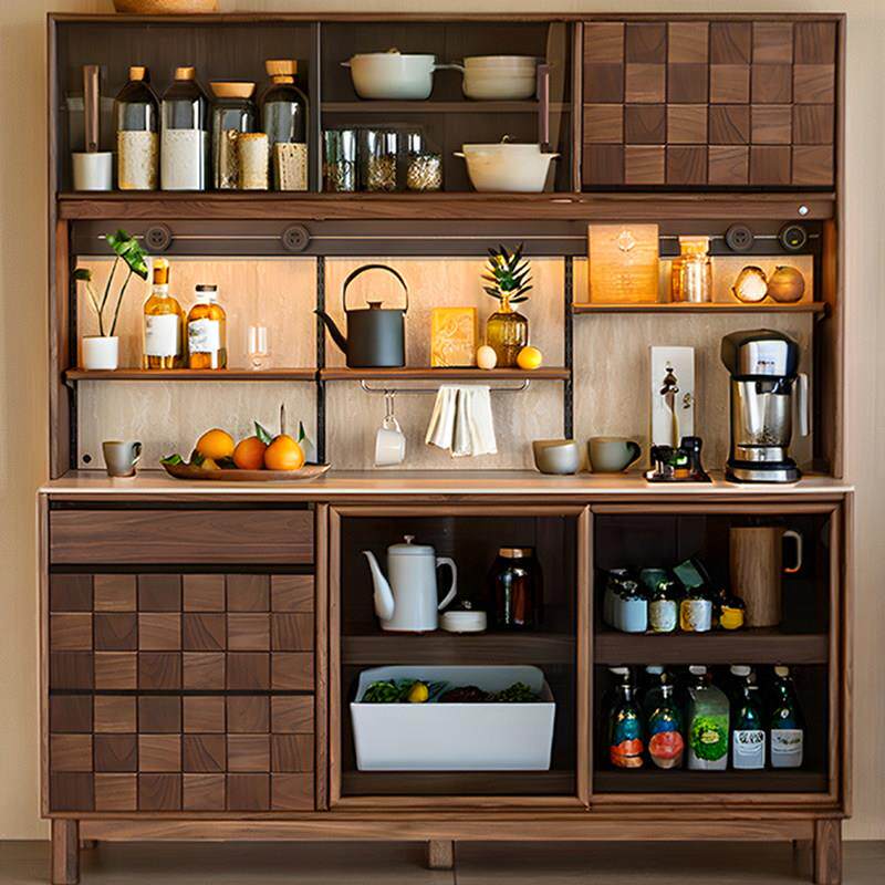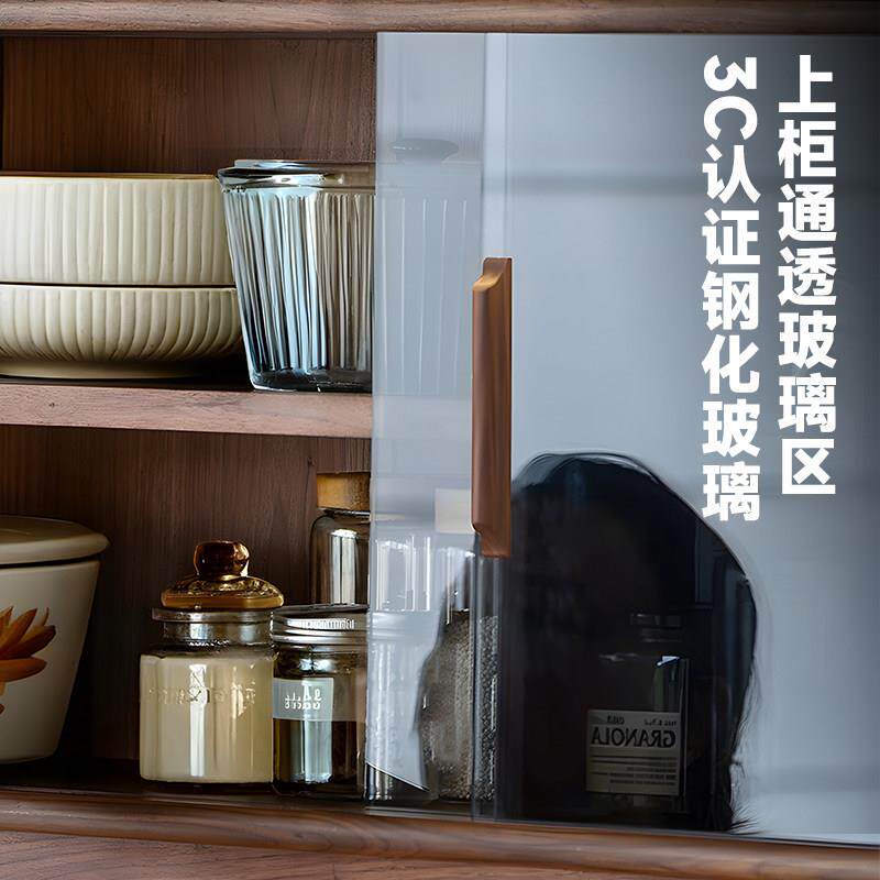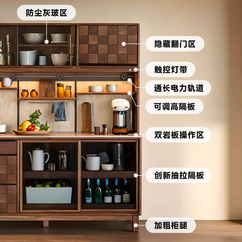 玄素家居全黑胡桃木餐边柜实木靠墙一体收纳柜子洞石岩板橱柜酒柜