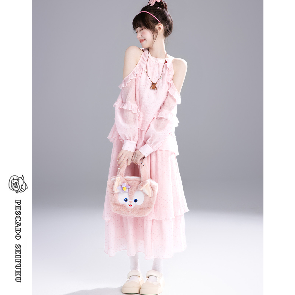 甜鱼少盐[莓莓塔]粉色露肩连衣裙套装女夏季甜美小个子裙子两件套