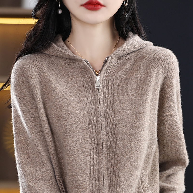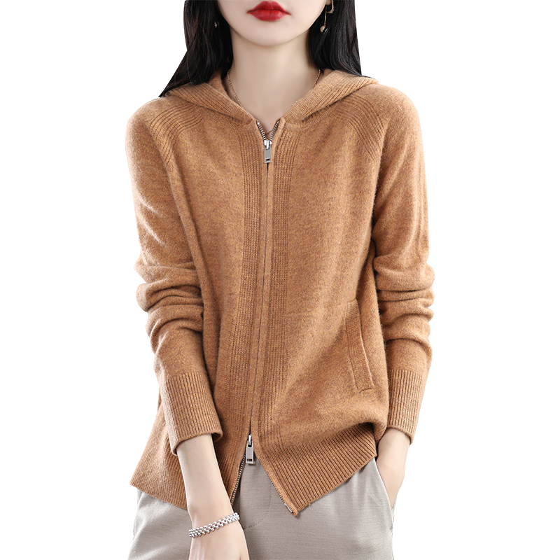 秋冬款100%羊毛开衫女连帽双拉链外套带兜毛衣宽松带帽羊绒衫外搭