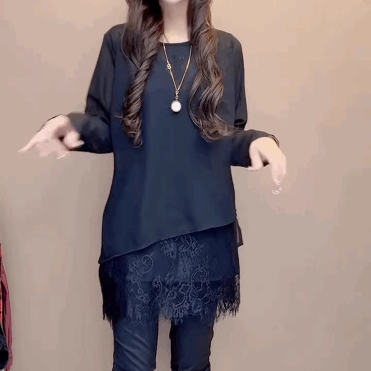 法式宽松中长款雪纺蕾丝T恤衬衫女假两件遮臀打底衫黑色圆领上衣