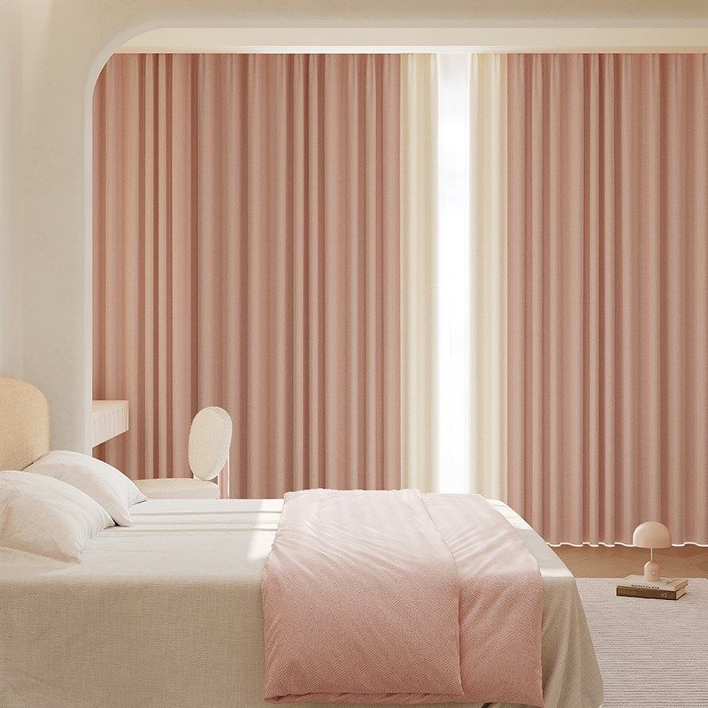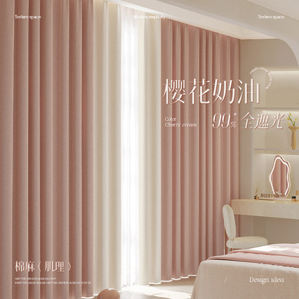 棉麻遮光窗帘卧室高级感女生全w遮光2024新款免打孔安装粉色挂钩
