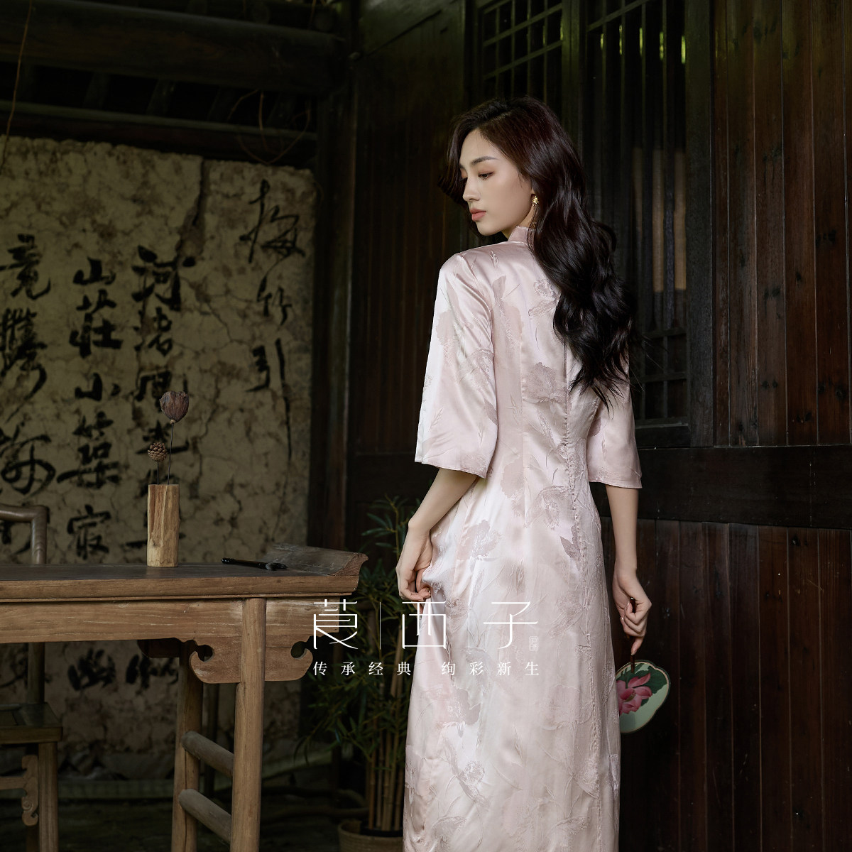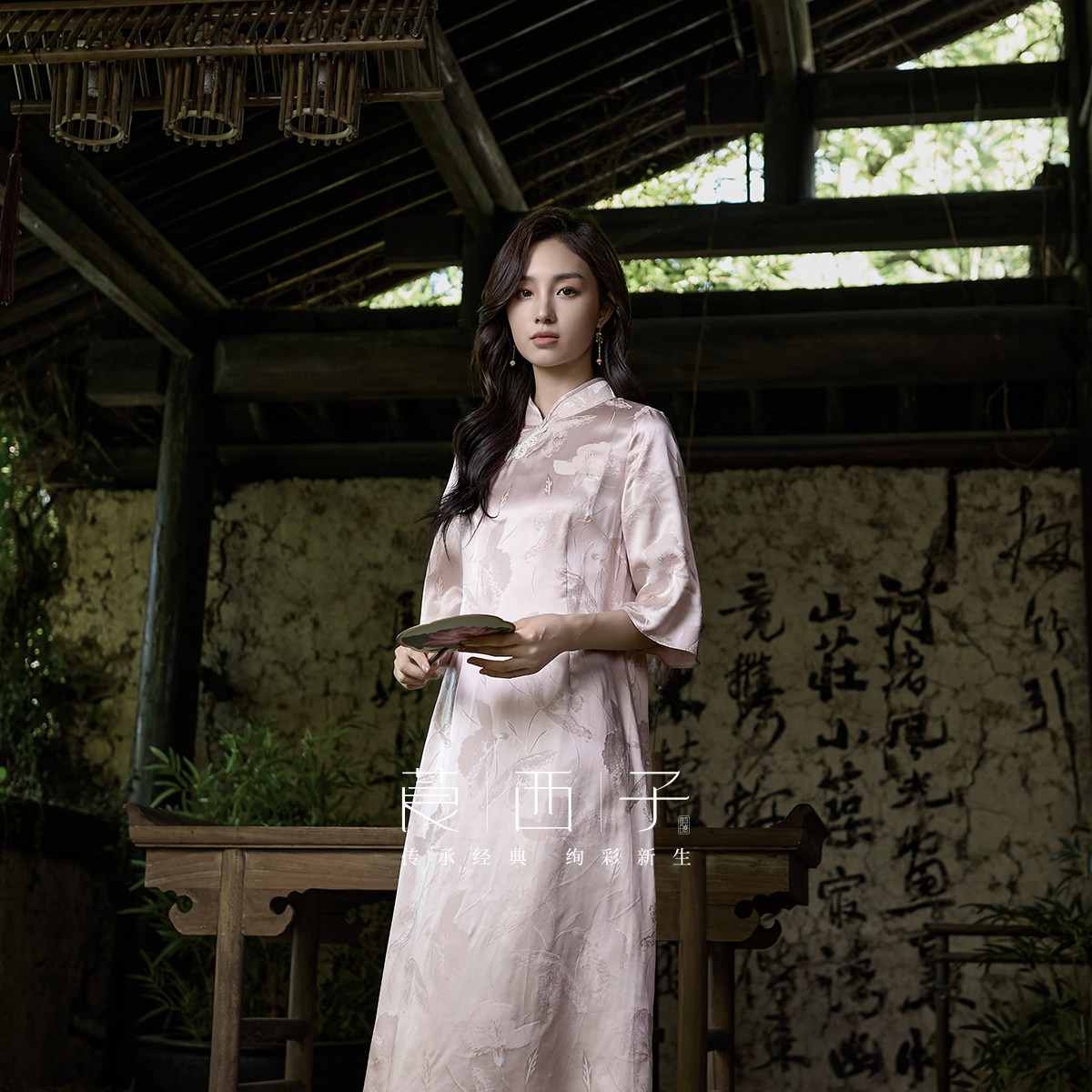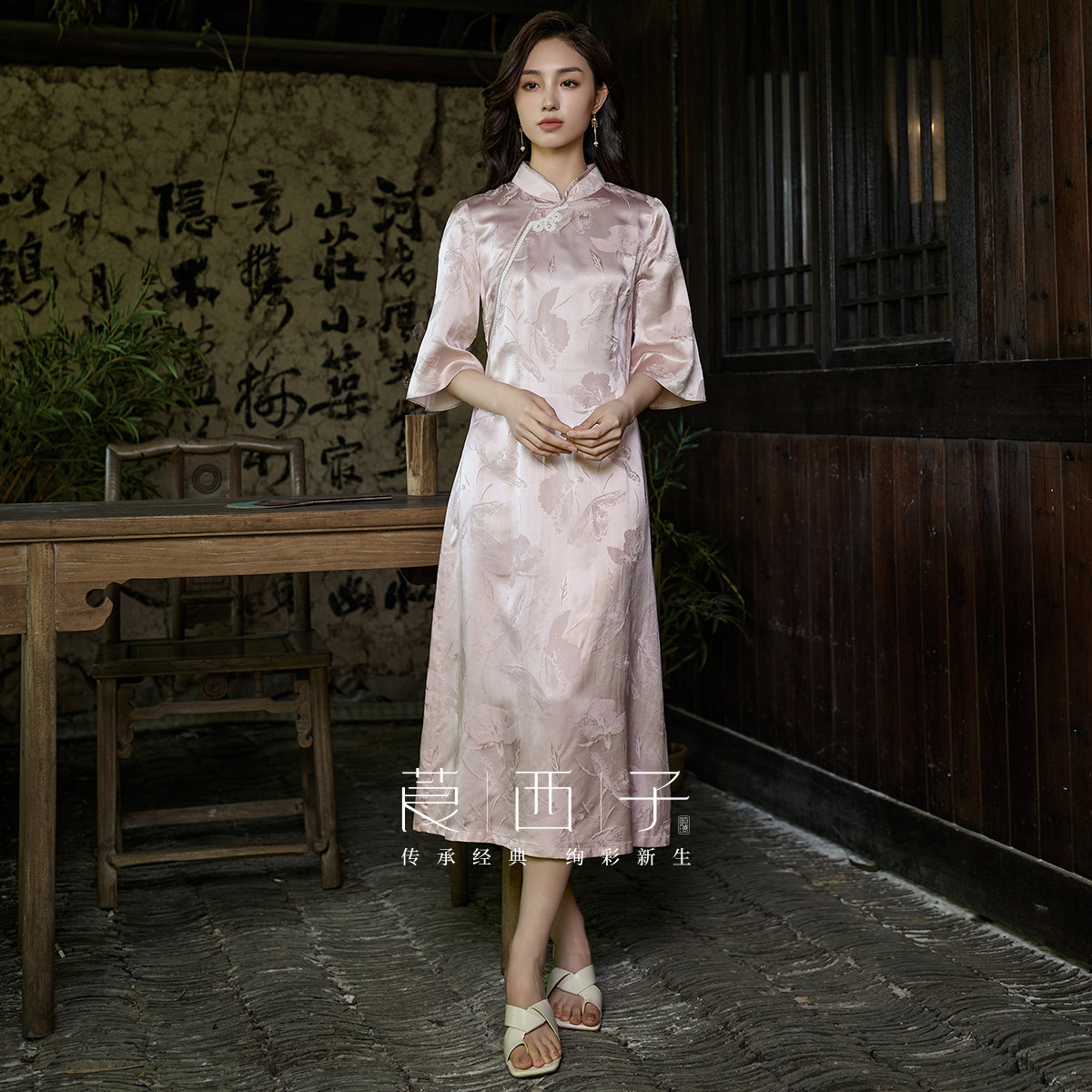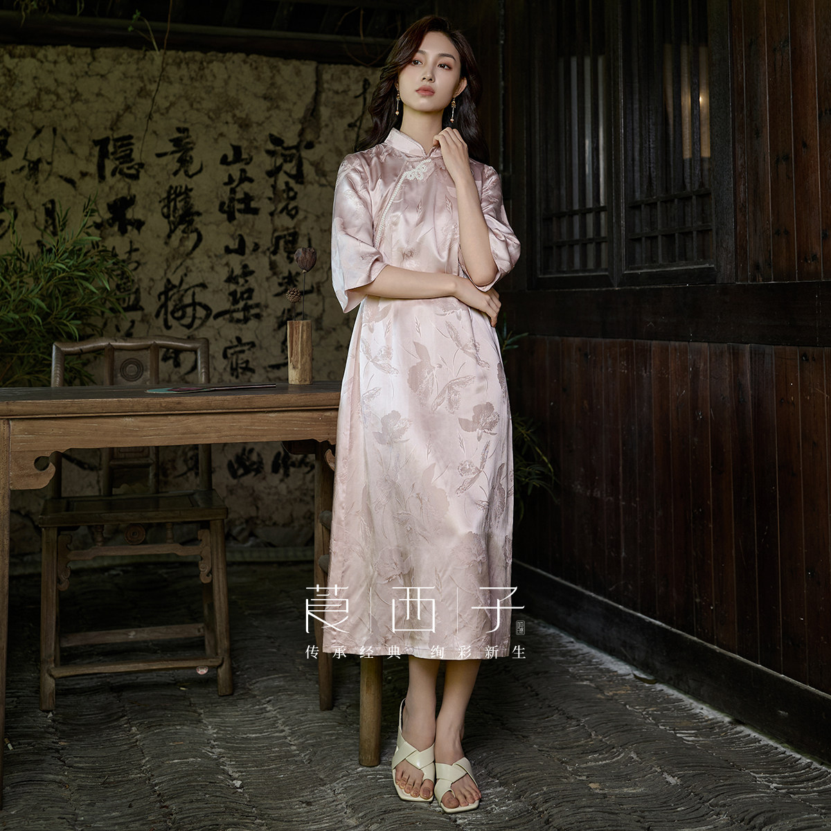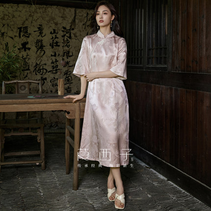 【清】莨西子新中式国风桑蚕真丝短袖立领连衣裙女复古大气裙子