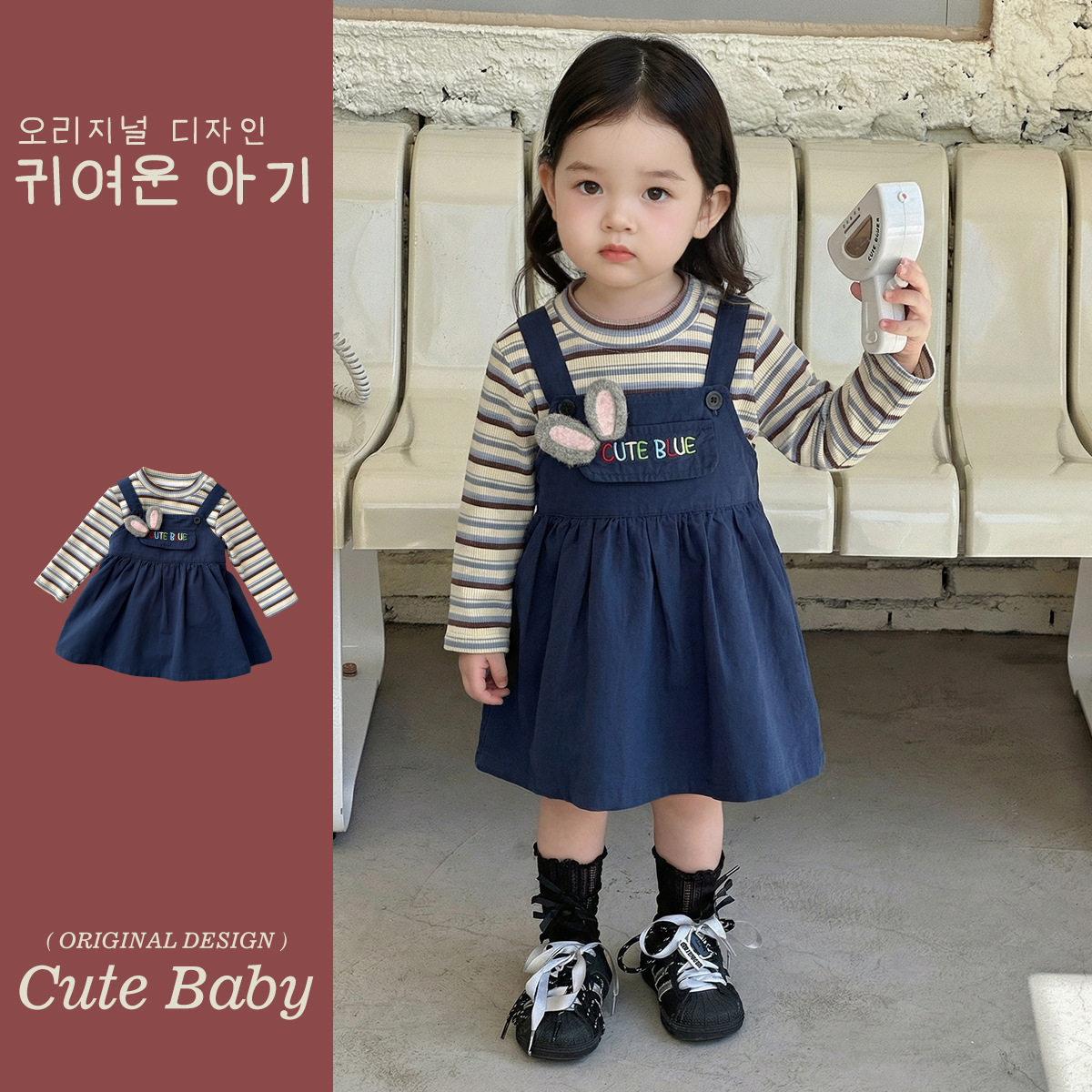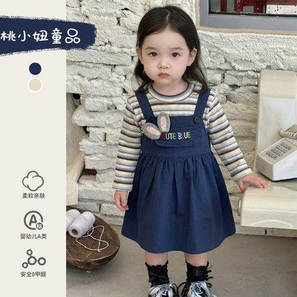 女宝宝春装套装2026新款洋气时髦韩版条纹打底衫背带裙分体两件套