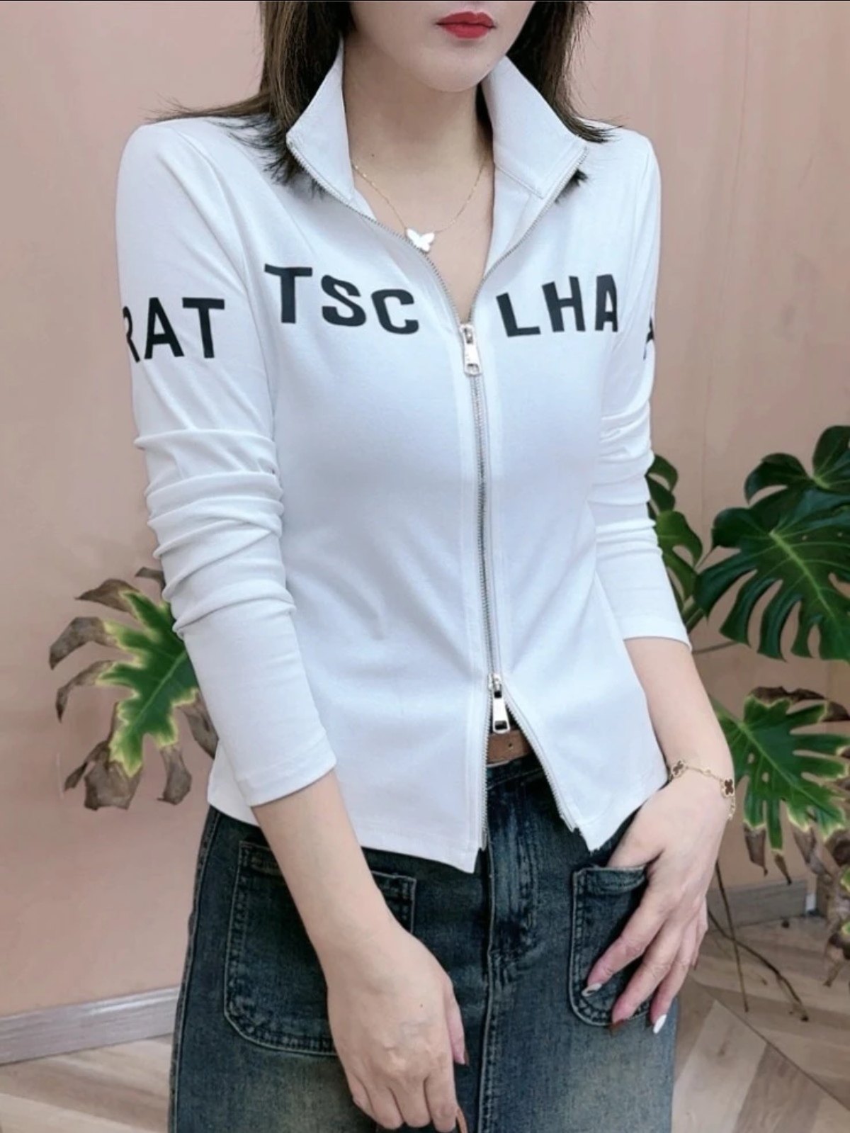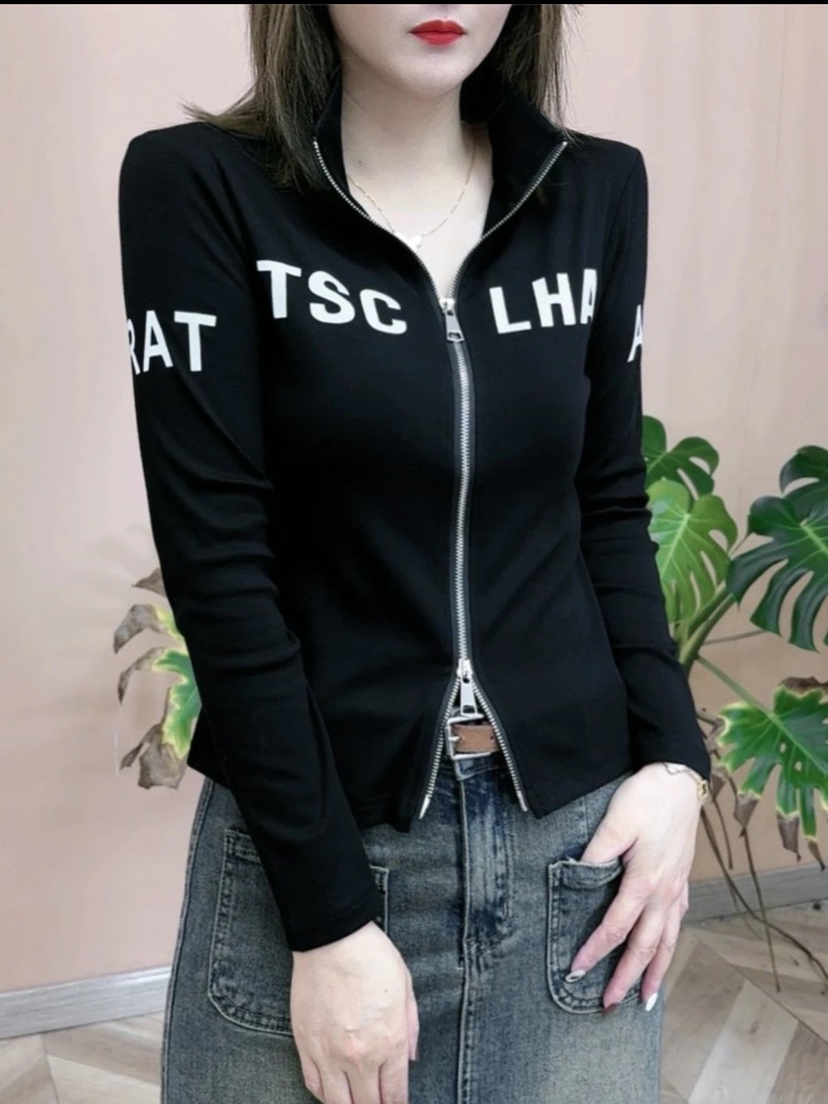 欧洲站女装百搭新款春夏字母双拉链女长袖t恤短款修身上衣设计感