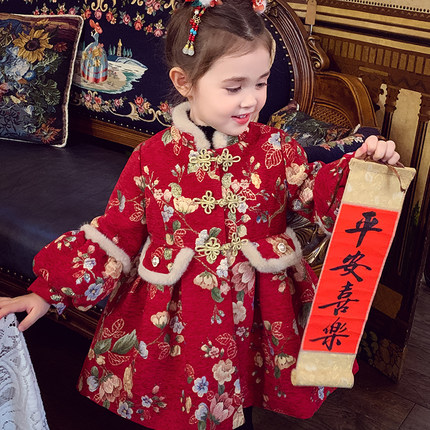 女童连衣裙女孩夹棉拜年服冬装2025新款儿童中国风红色新年公主裙