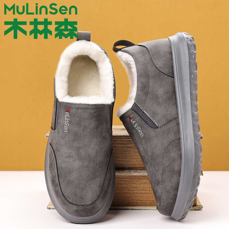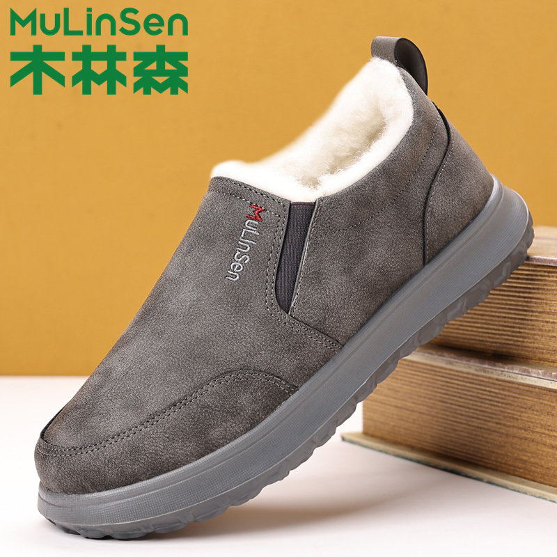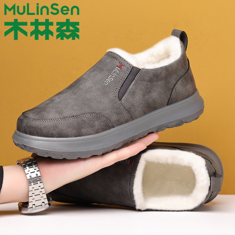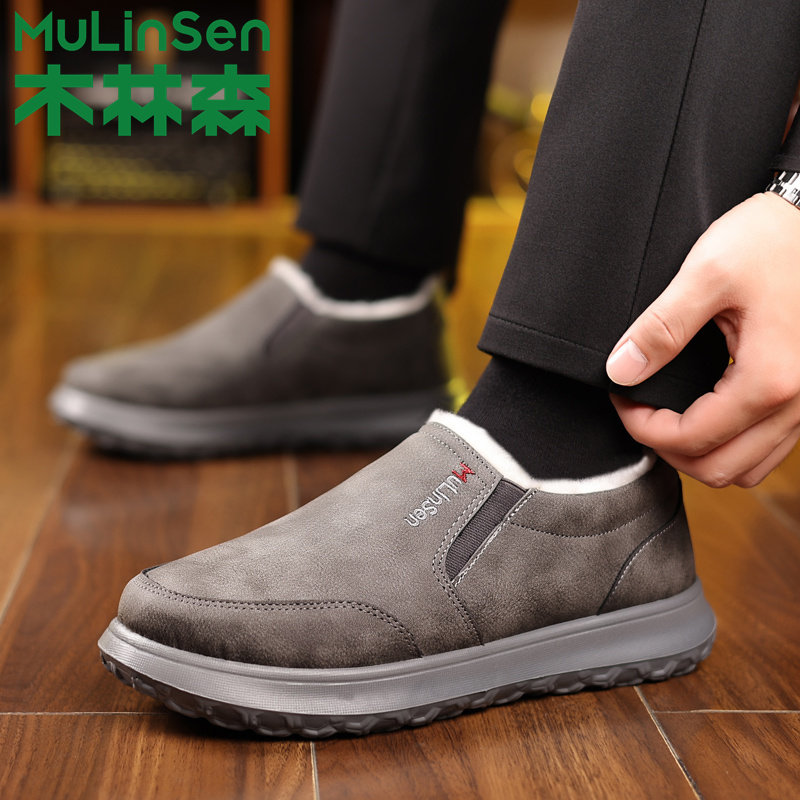 木林森男鞋冬季羊毛加绒加厚保暖棉鞋一脚蹬休闲面包中老年爸爸鞋