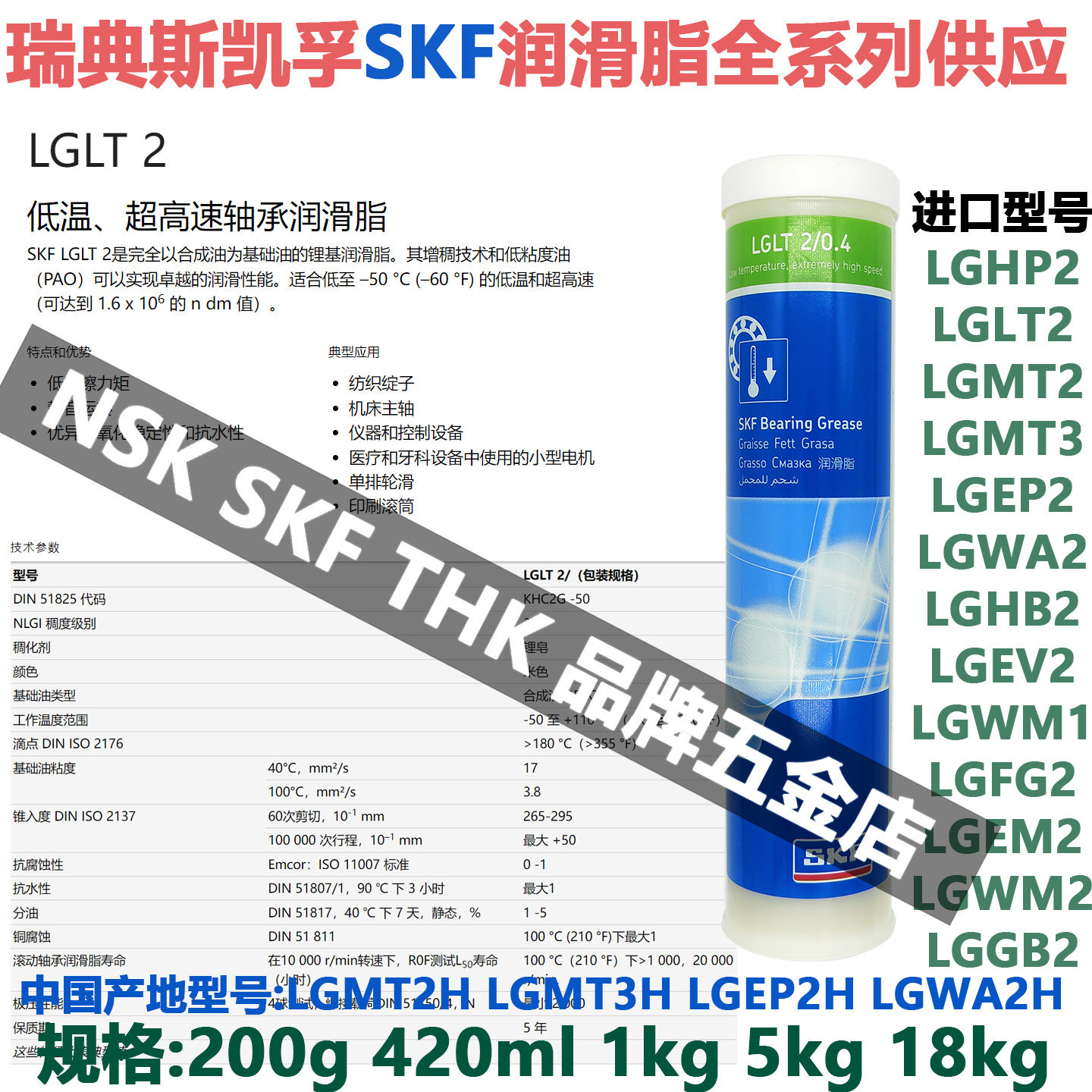 瑞典斯凯孚SKF进口润滑脂LGLT2低温低粘度超高速机床主轴轴承通用