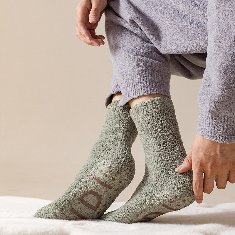 加绒袜子男士冬季加厚保暖中筒珊瑚绒地板袜防滑硅胶居家睡眠袜子