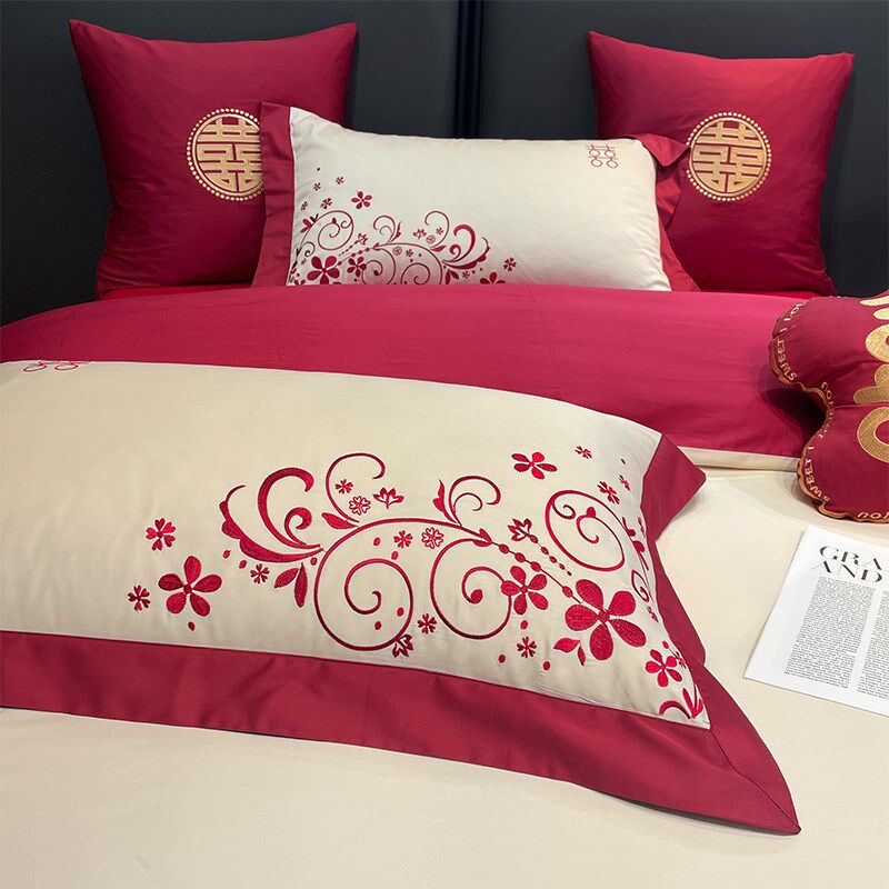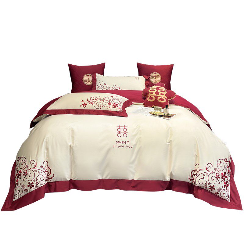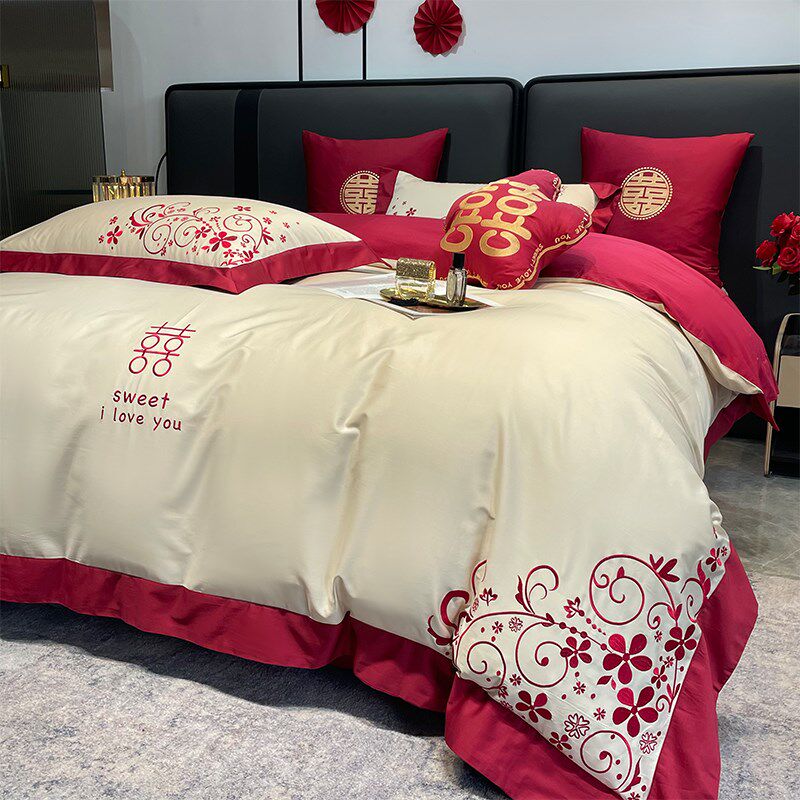 高级感160支长绒棉结婚四件套红色婚庆被套床单喜被床上用品4