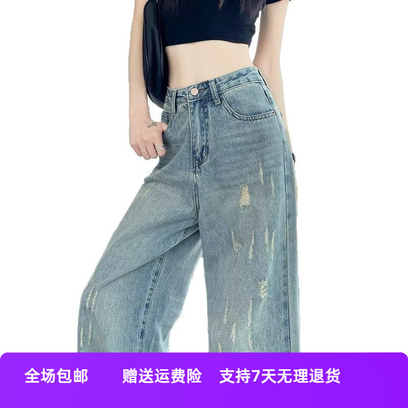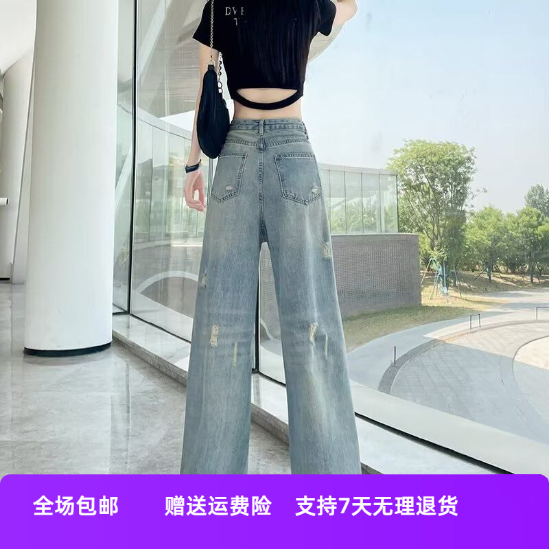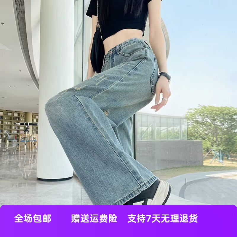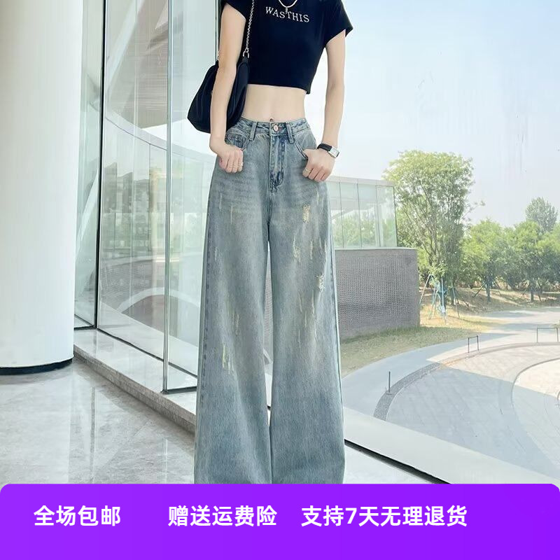 拖地阔腿牛仔裤2025新款春秋设计感水洗裤小个子直筒破洞浅蓝色女