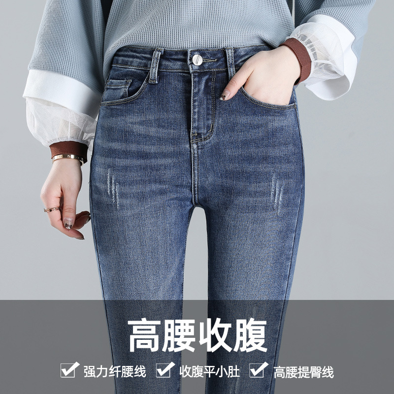 高腰牛仔裤女高个子【弹力】春秋季弹力显瘦紧身修身九分小脚长裤