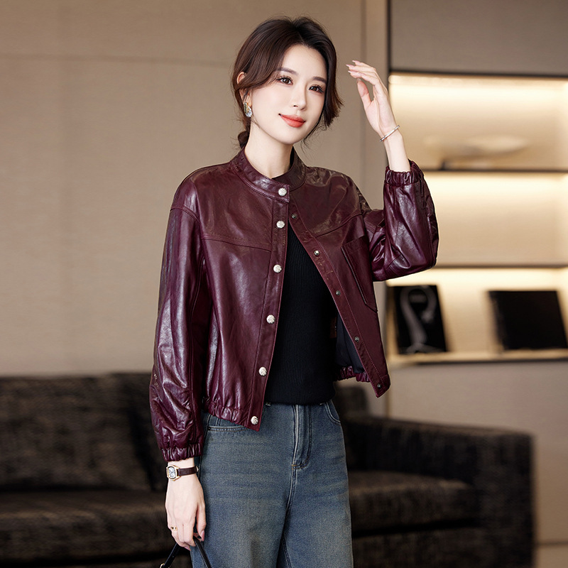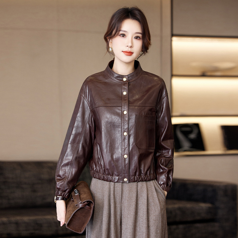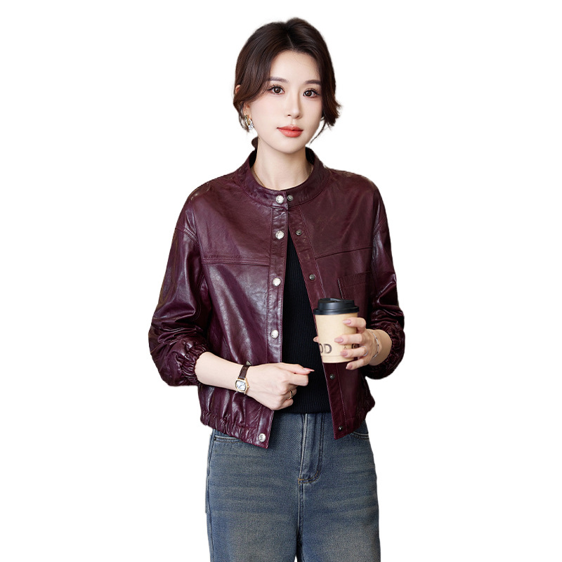 立领小款绵羊皮皮衣外套女春秋单排扣休闲气质短款真皮夹克上衣高