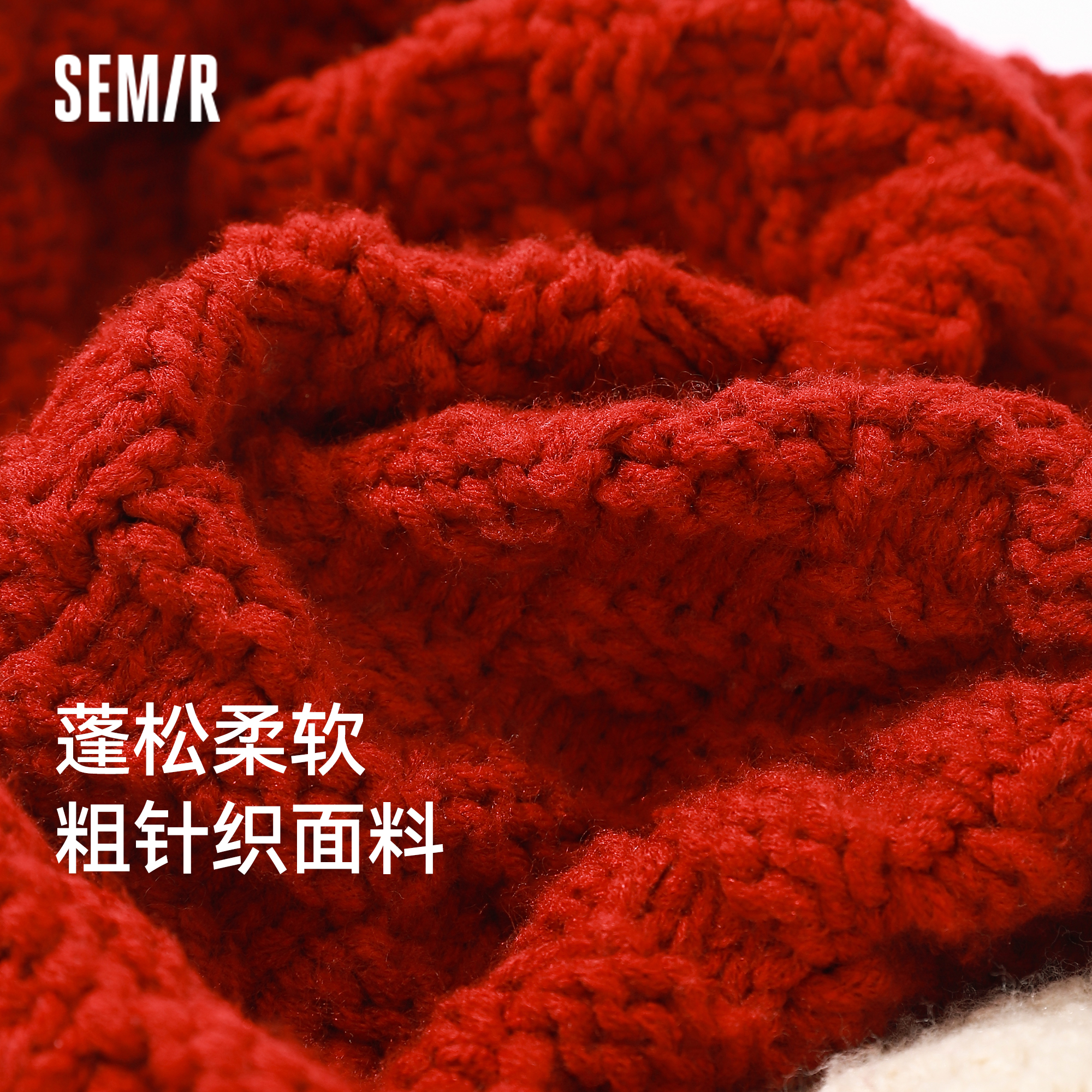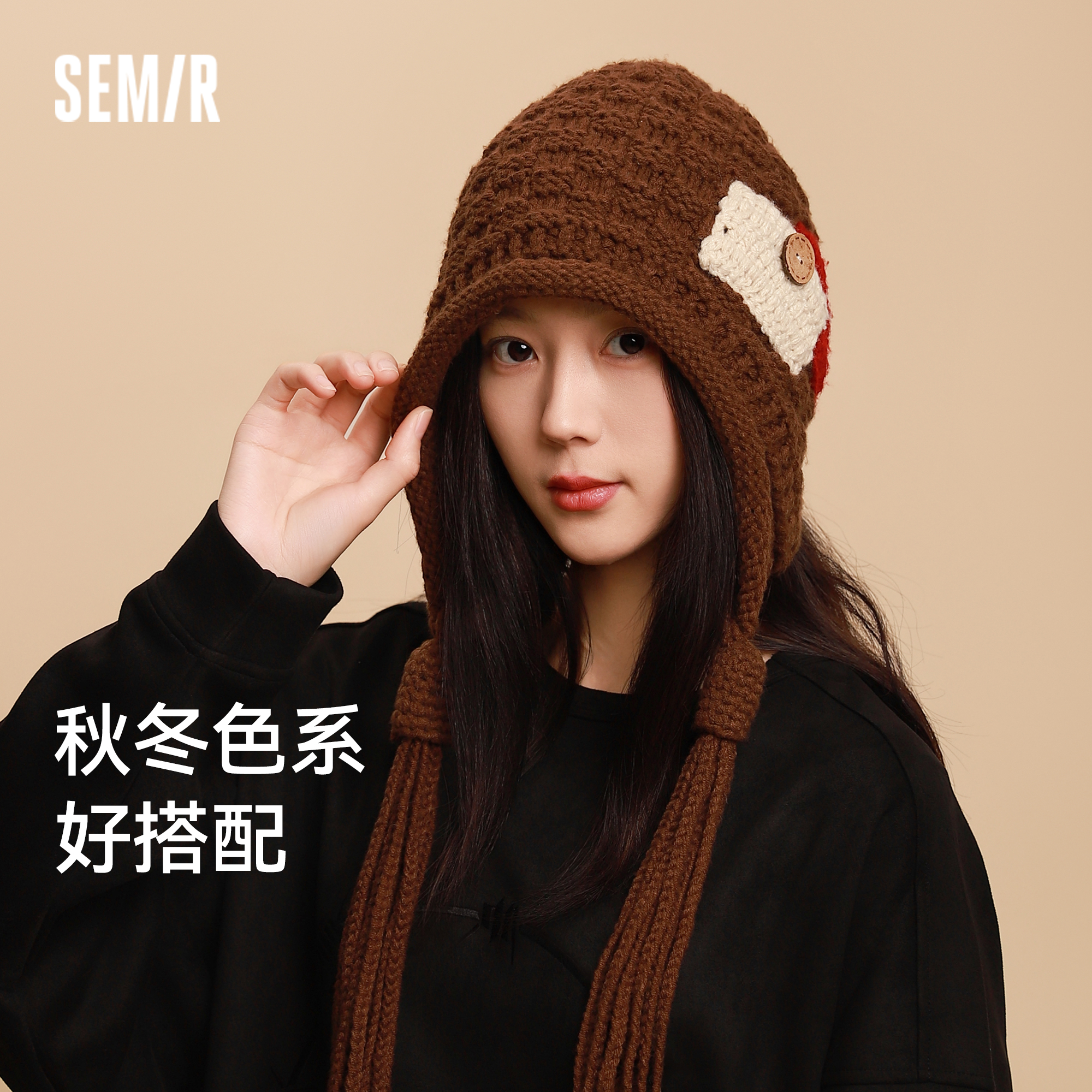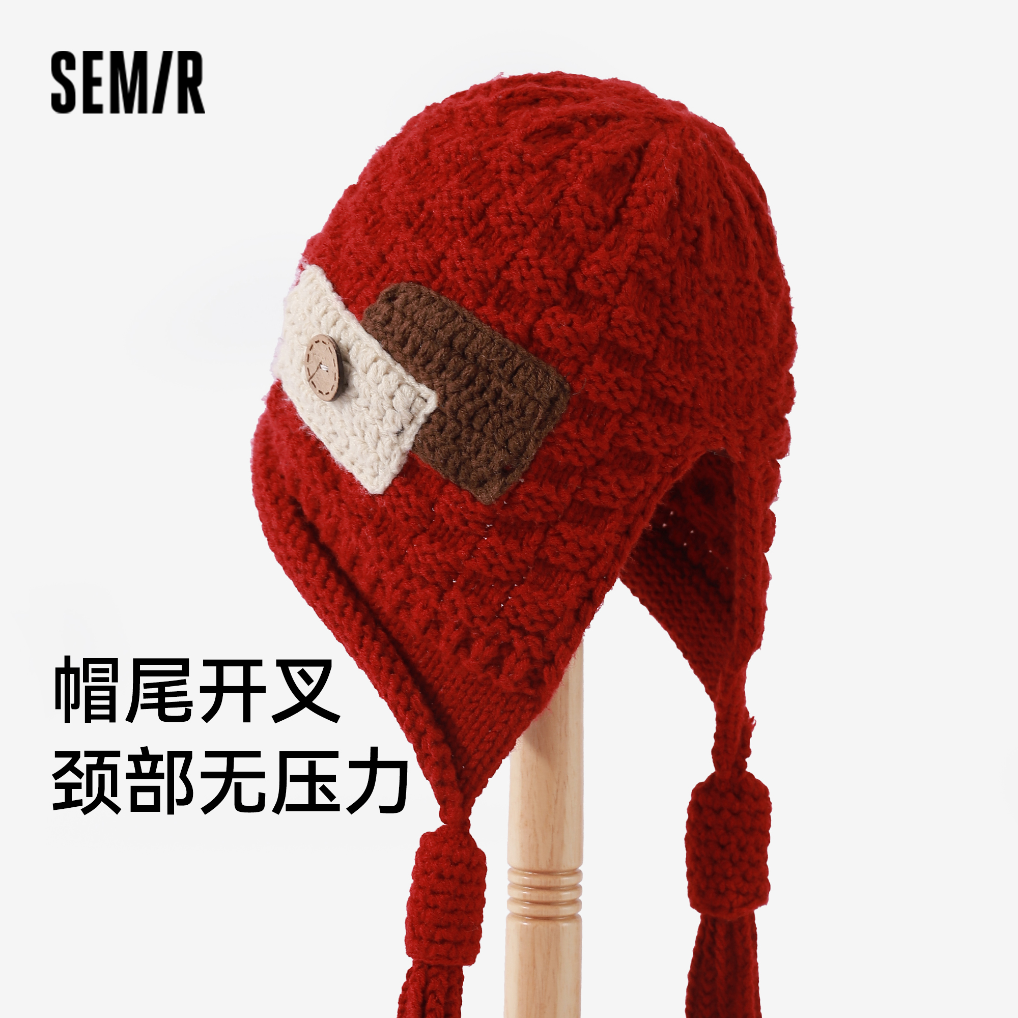 森马2025新款女秋冬季针织护耳帽子红色编织流苏辫子毛线小红帽M