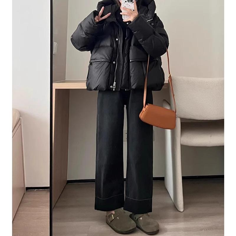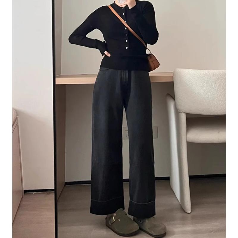 黑色窄版直筒牛仔裤女春季新款大码胖妹妹mm显瘦小个子卷边阔腿裤