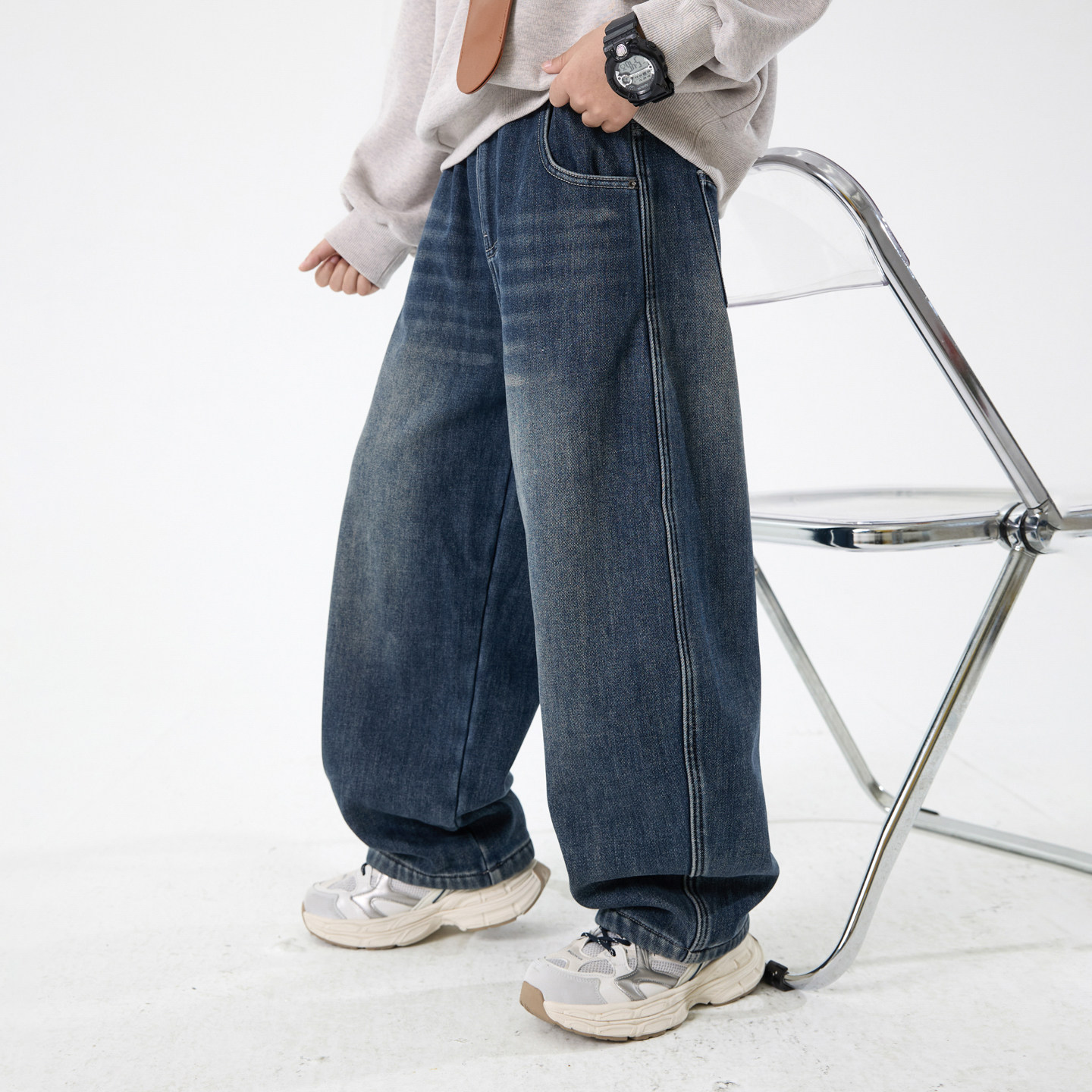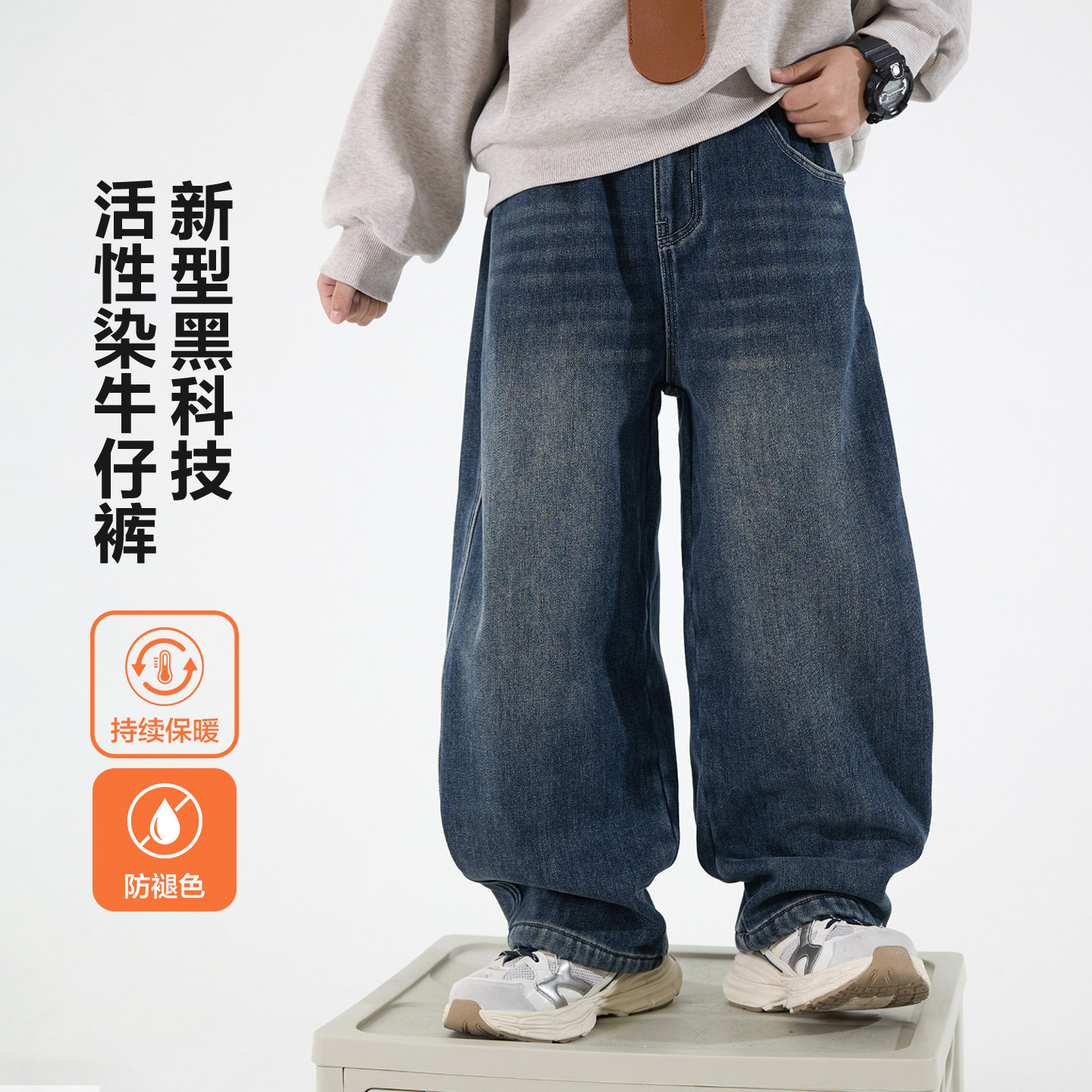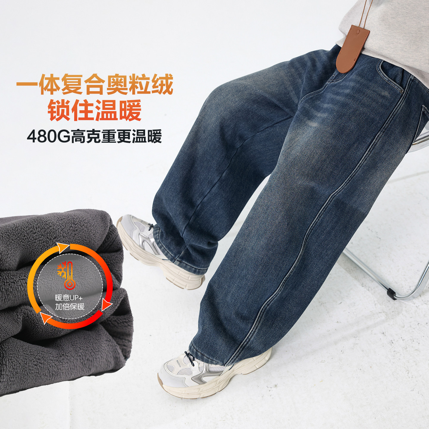 不易褪色一体绒阔腿直筒牛仔裤潮
