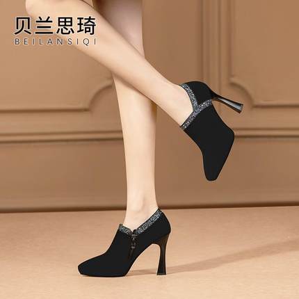 磨砂真皮尖头拼接深口细跟单鞋女2025春秋季新款防水台高跟鞋