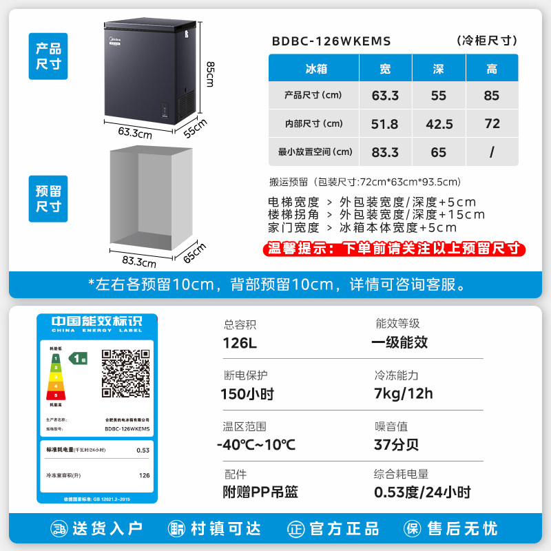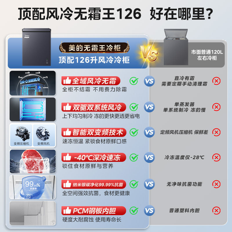 【新品】美的无霜王126小冰柜风冷家用变频冷柜冷冻冷藏两用冰箱
