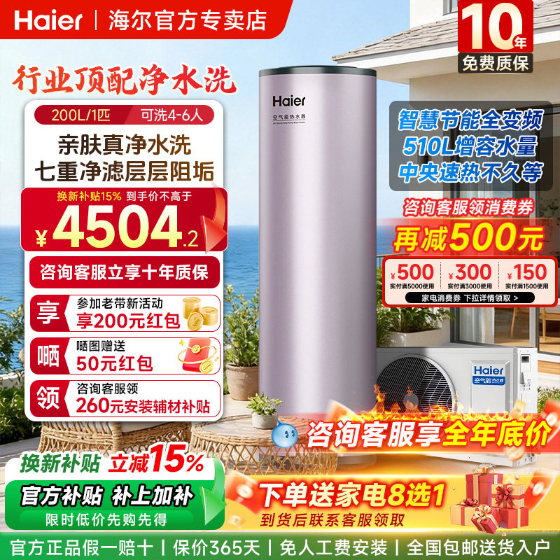 【国补15%】海尔空气能热水器家用200/300升26年新款热泵速热节能