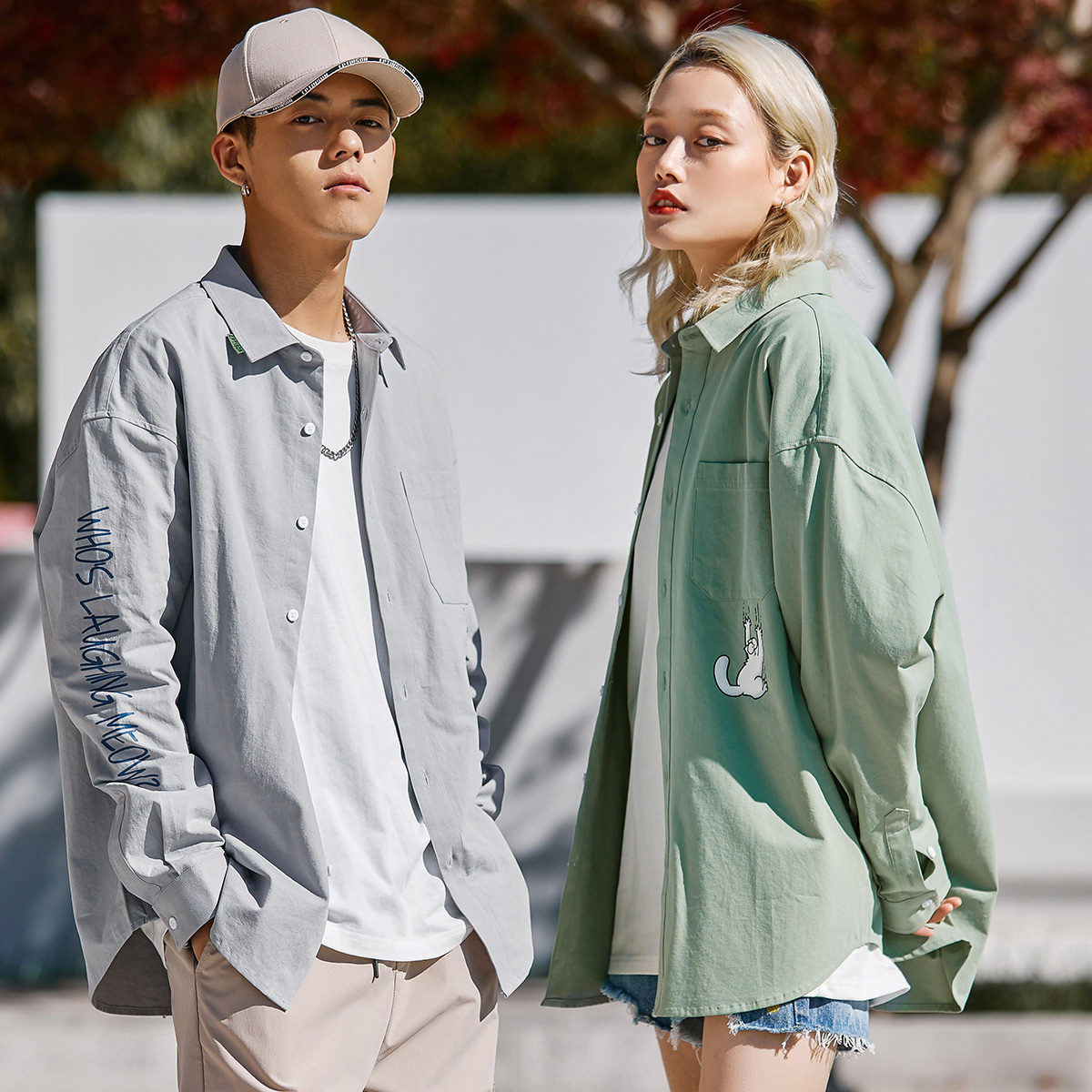 衣品天成2021秋装新款西蒙的猫联名纯色衬衫男ins减龄百搭情侣装