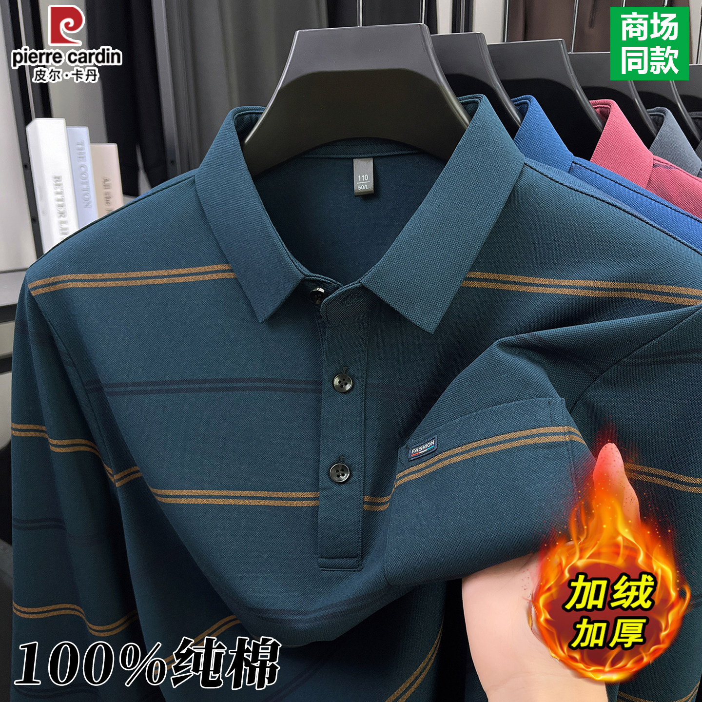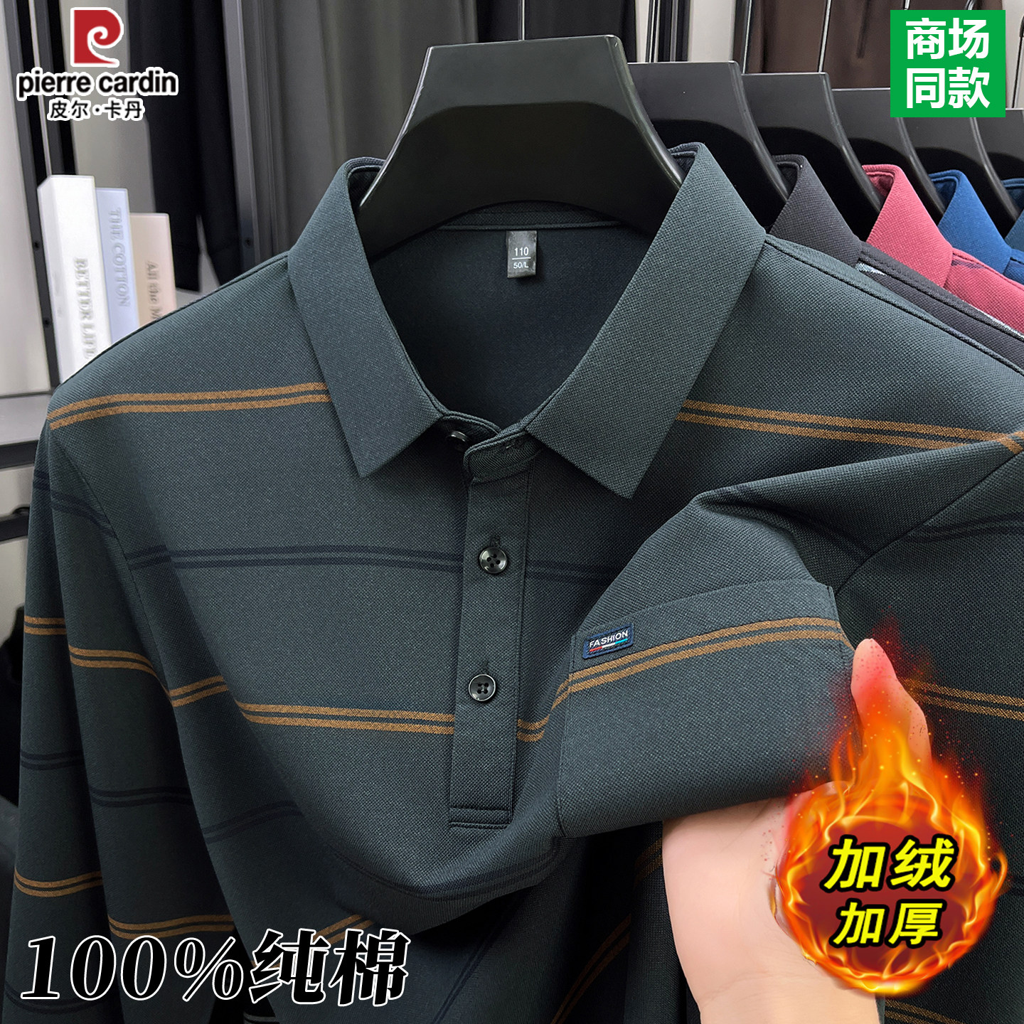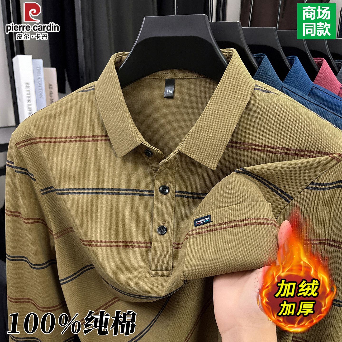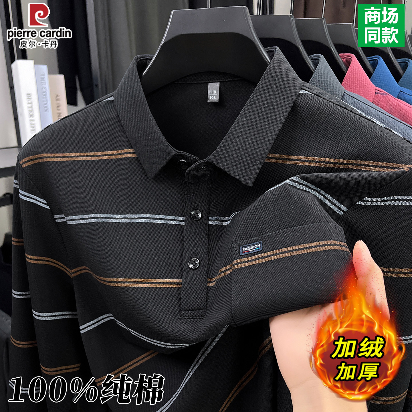 皮尔卡丹100%纯棉条纹t恤男士春秋冬季新款中老年加绒加厚POLO衫