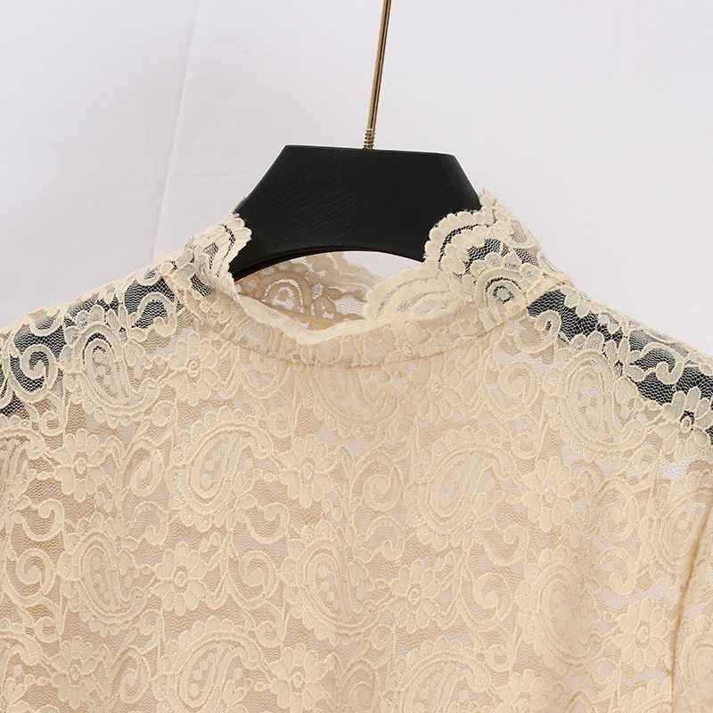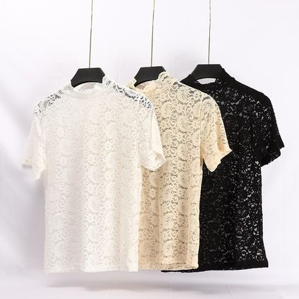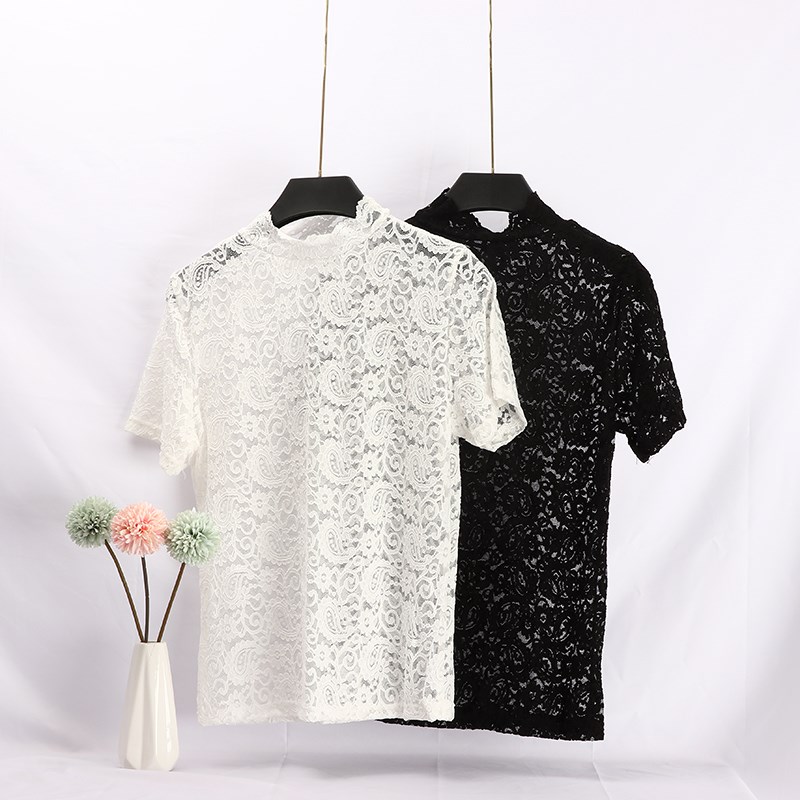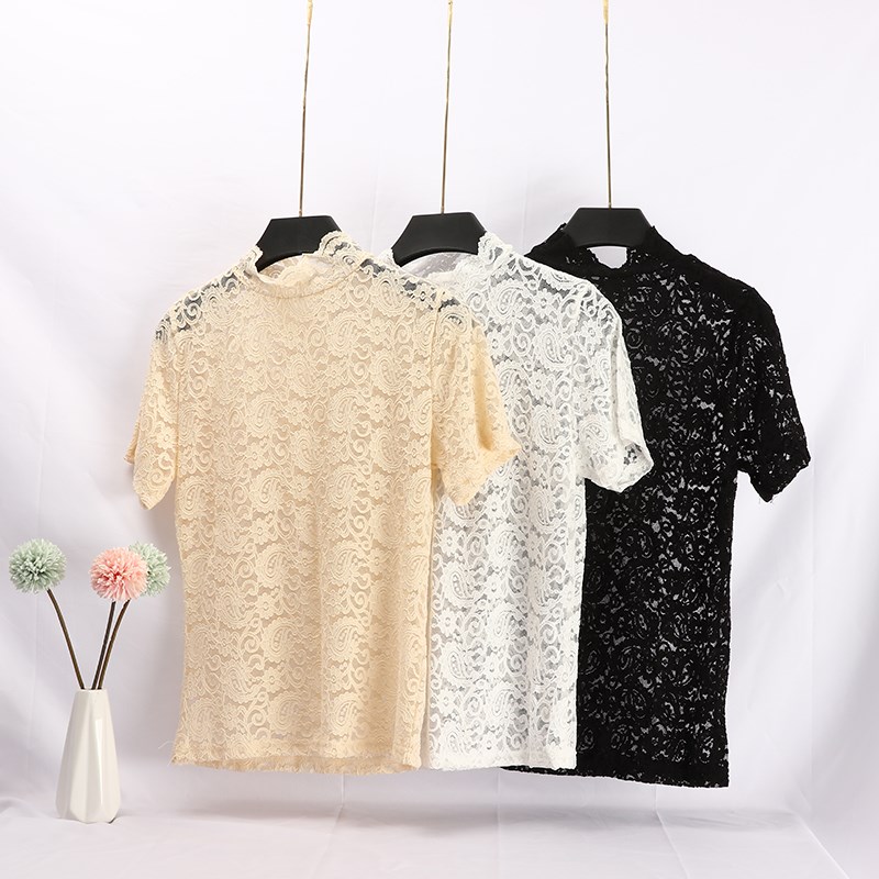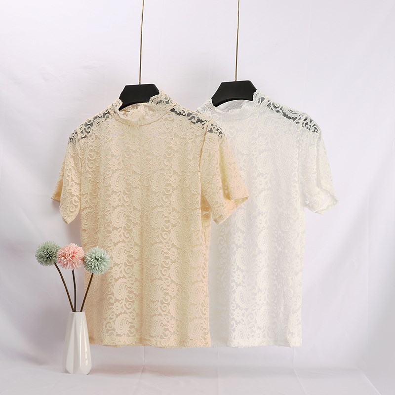蕾丝短袖上衣女夏季洋气小立领镂空薄款网纱内搭花边半高领打底衫