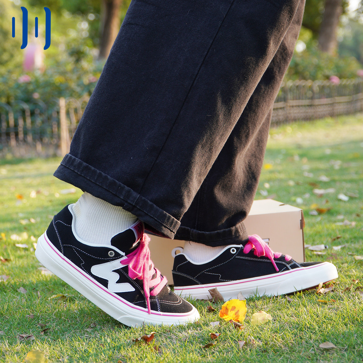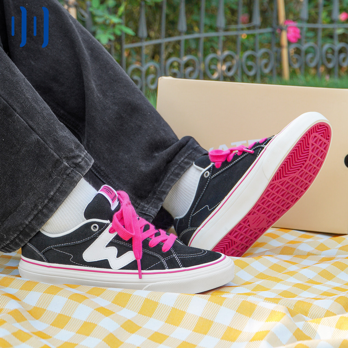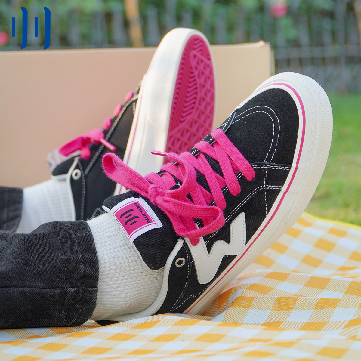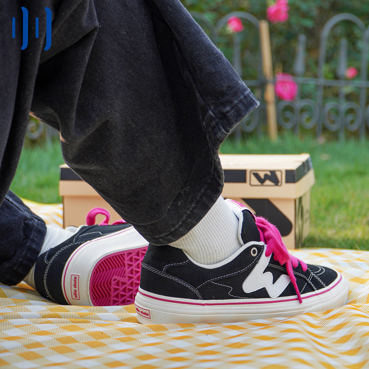 顽刻ollieskate黑粉拼色春季校园W系列翻毛皮拼接男女国潮滑板鞋