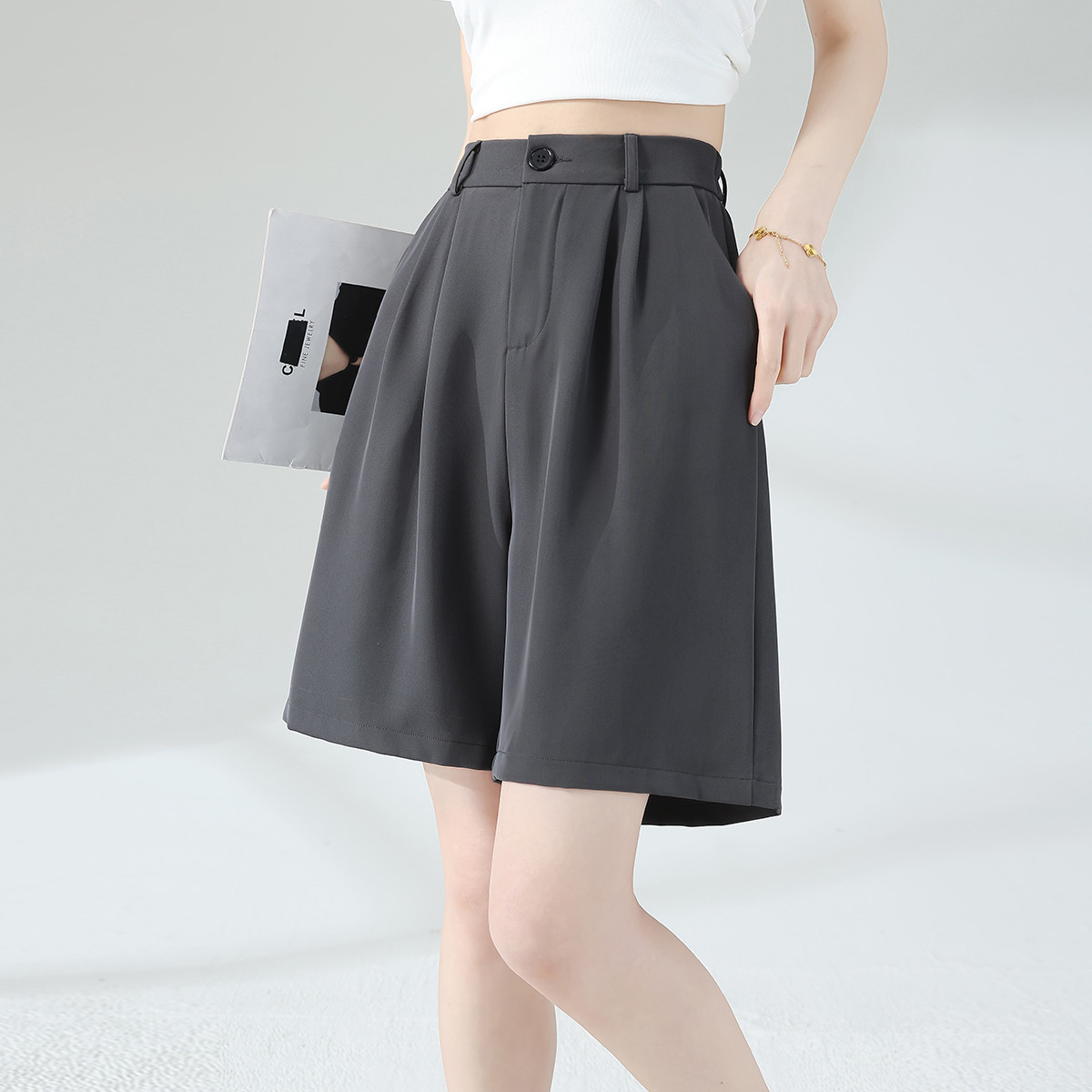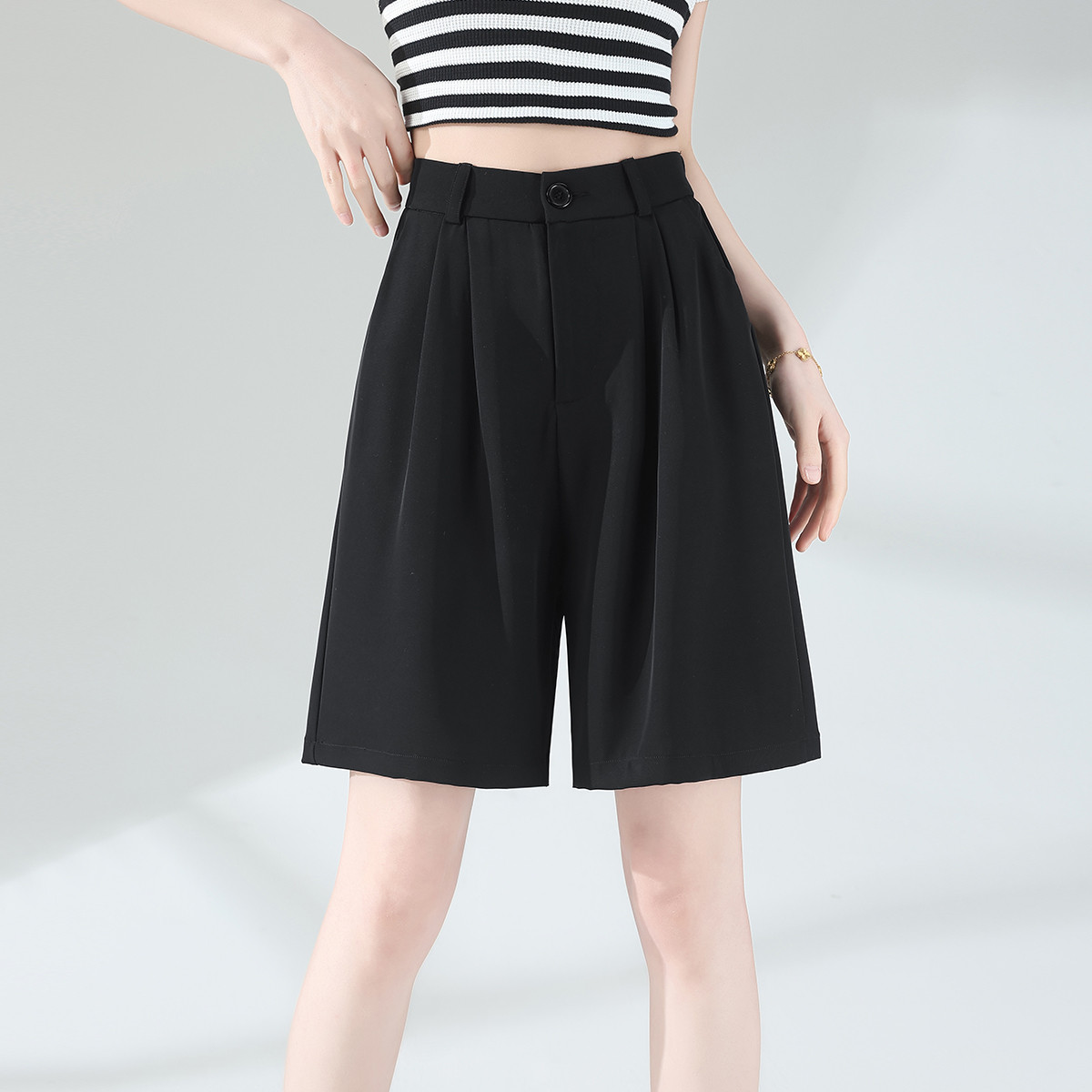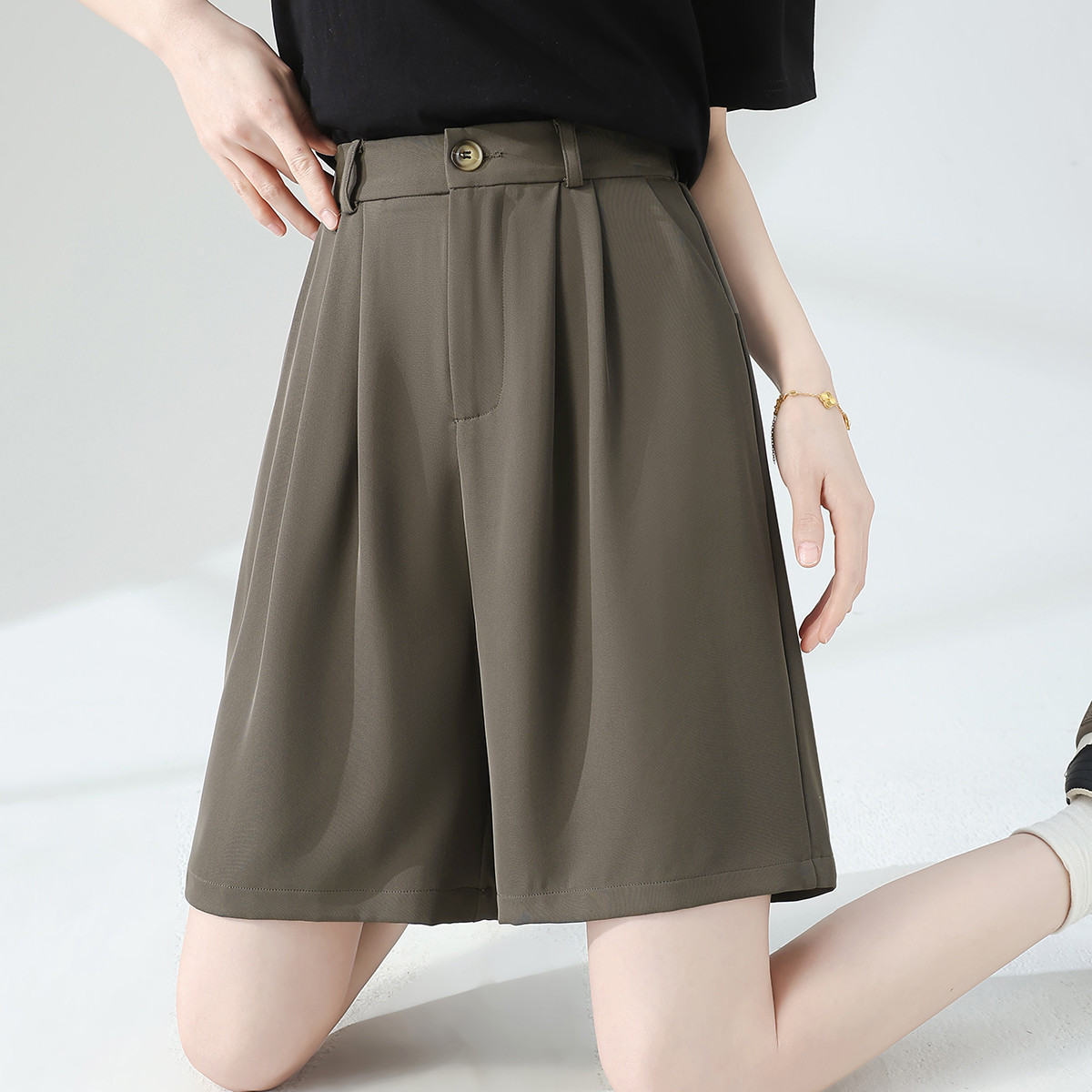 班尼路时尚西装冰丝休闲短裤女夏季薄款高腰显瘦捏褶垂顺阔腿裤J