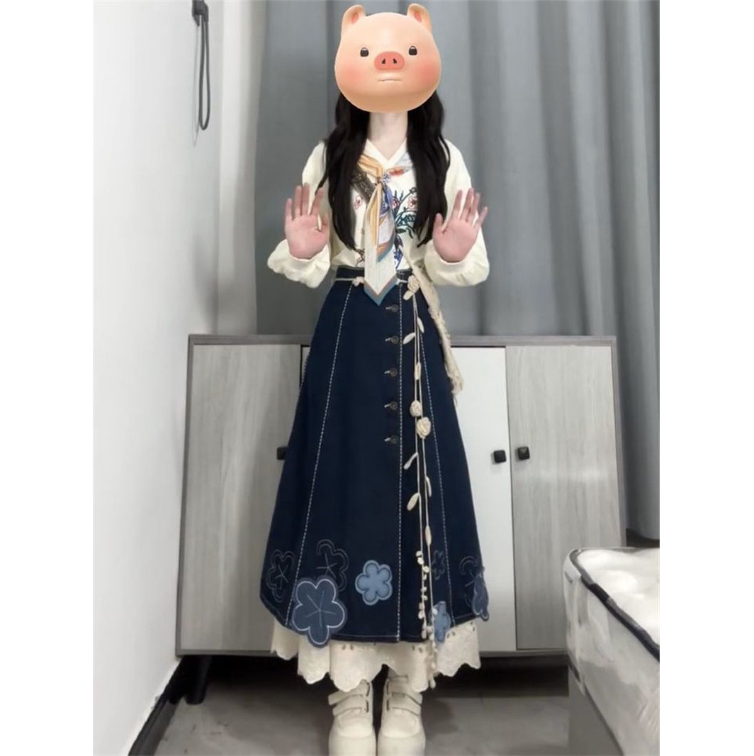温柔学院风气质穿搭贴布牛仔半身裙女学生搭配丝巾绑带上衣两件套