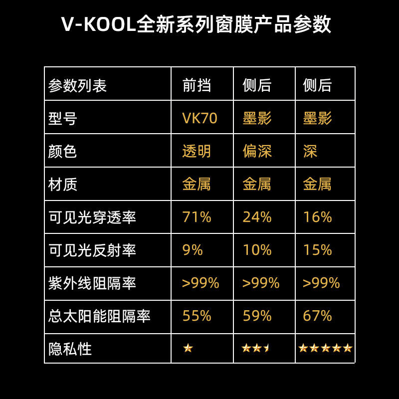 VKOOL威固VK70+墨影金属汽车贴膜隔热膜太阳膜贴膜汽车窗膜全车膜