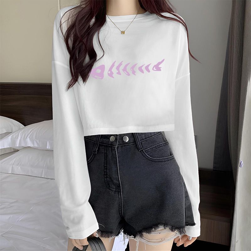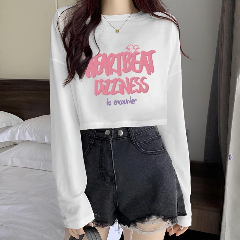 纯棉白色短款t恤女生宽松显瘦露脐秋季纯色ins长袖设计感上衣潮流