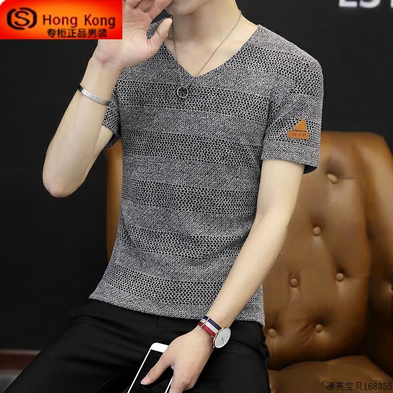 夏季冰丝短袖T恤男2025新款潮牌高端V领半袖桑蚕丝真丝男士体恤衫