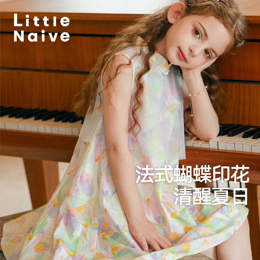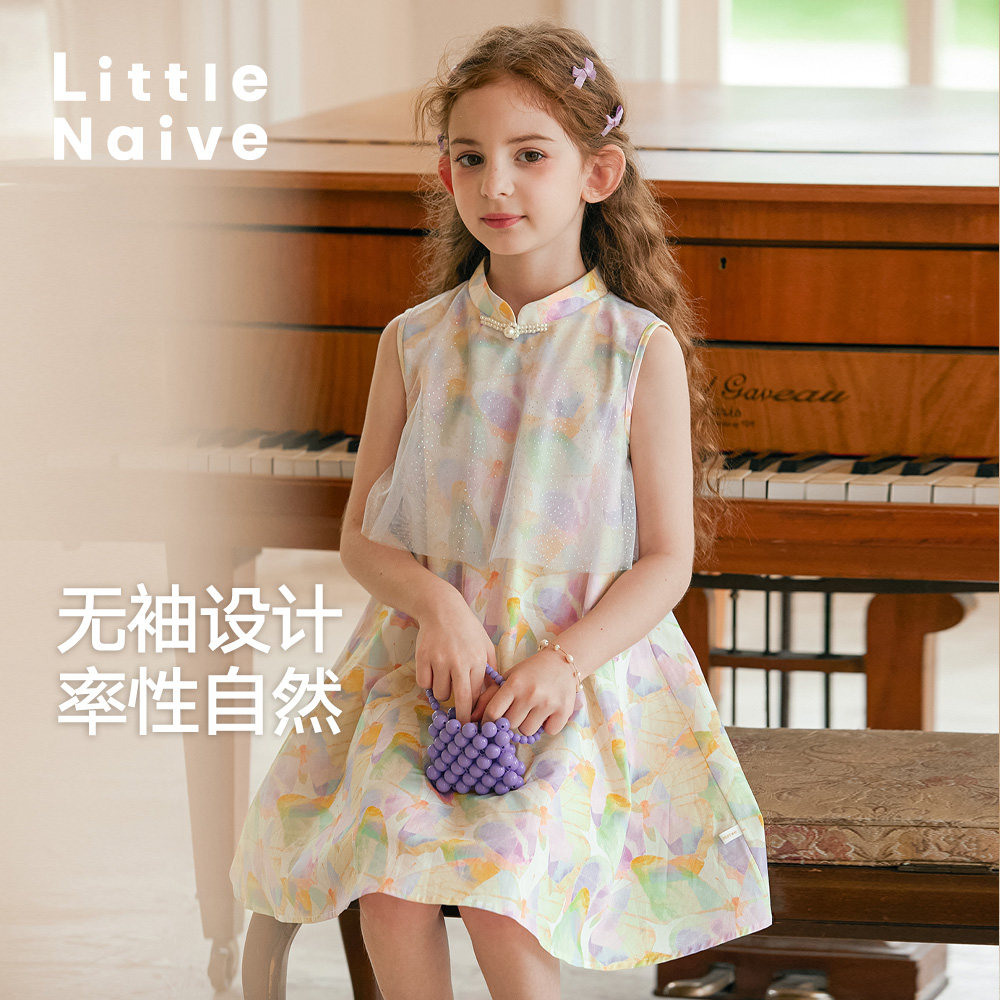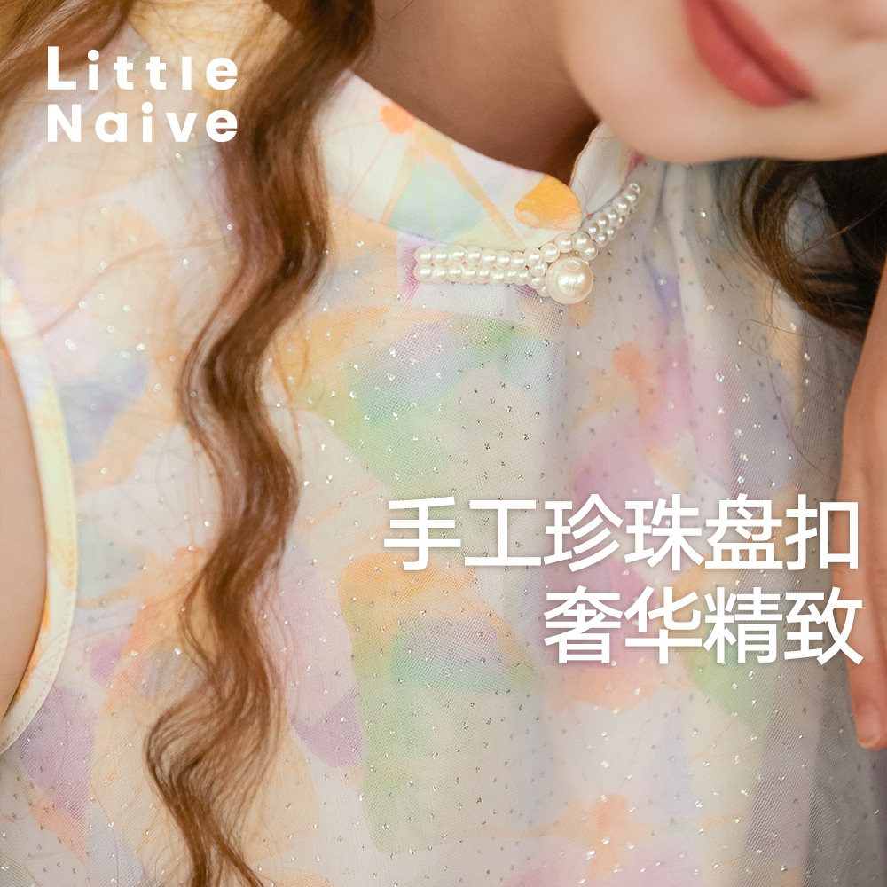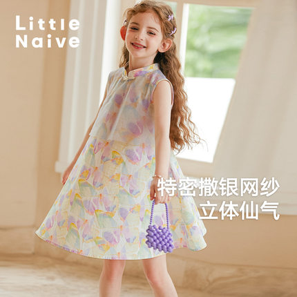 LittleNaive儿童碎花连衣裙夏季新款网纱旗袍裙女童中式背心裙