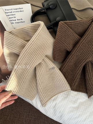 含羊毛简约针织小围巾女秋冬季韩版减龄百搭纯色保暖交叉毛线围脖