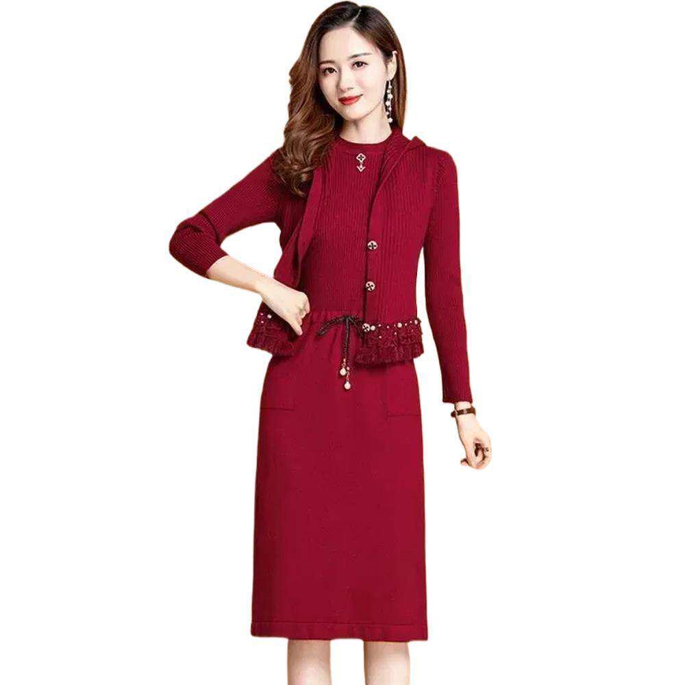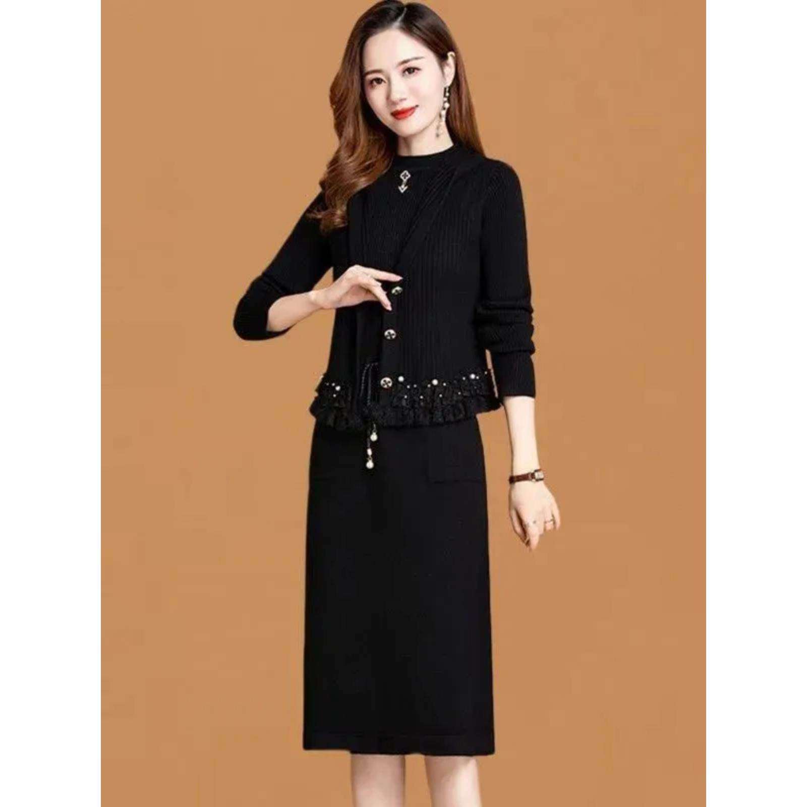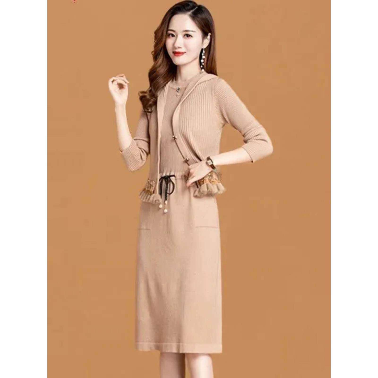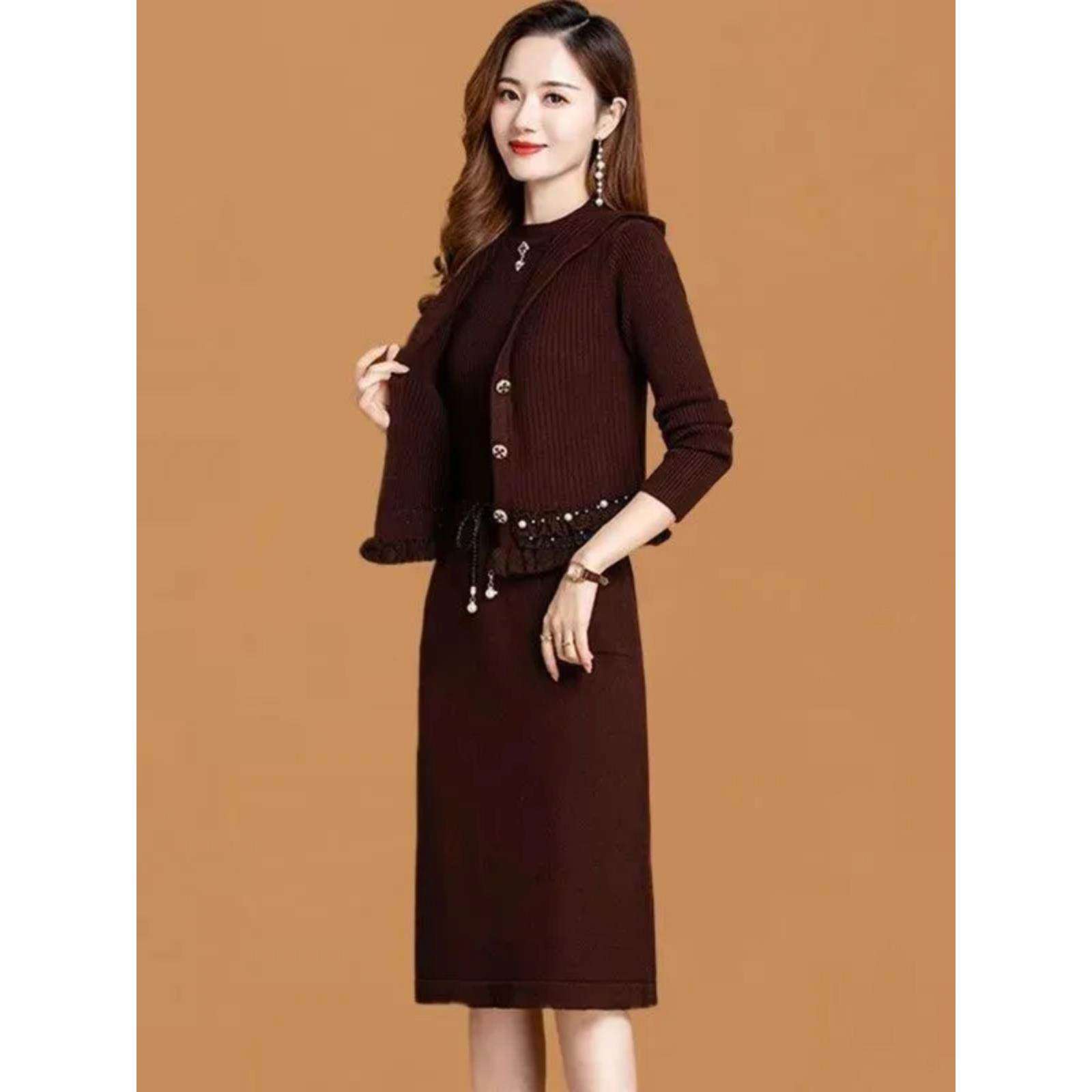 妈妈秋装连衣裙套装洋气针织马甲两件套中老年女装秋冬打底毛衣裙