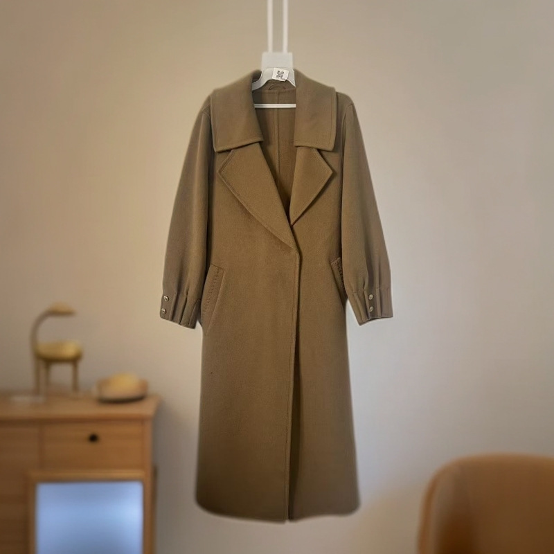 来此购 女士秋冬款时尚宽松双面长款羊毛呢大衣大翻领带腰带外套