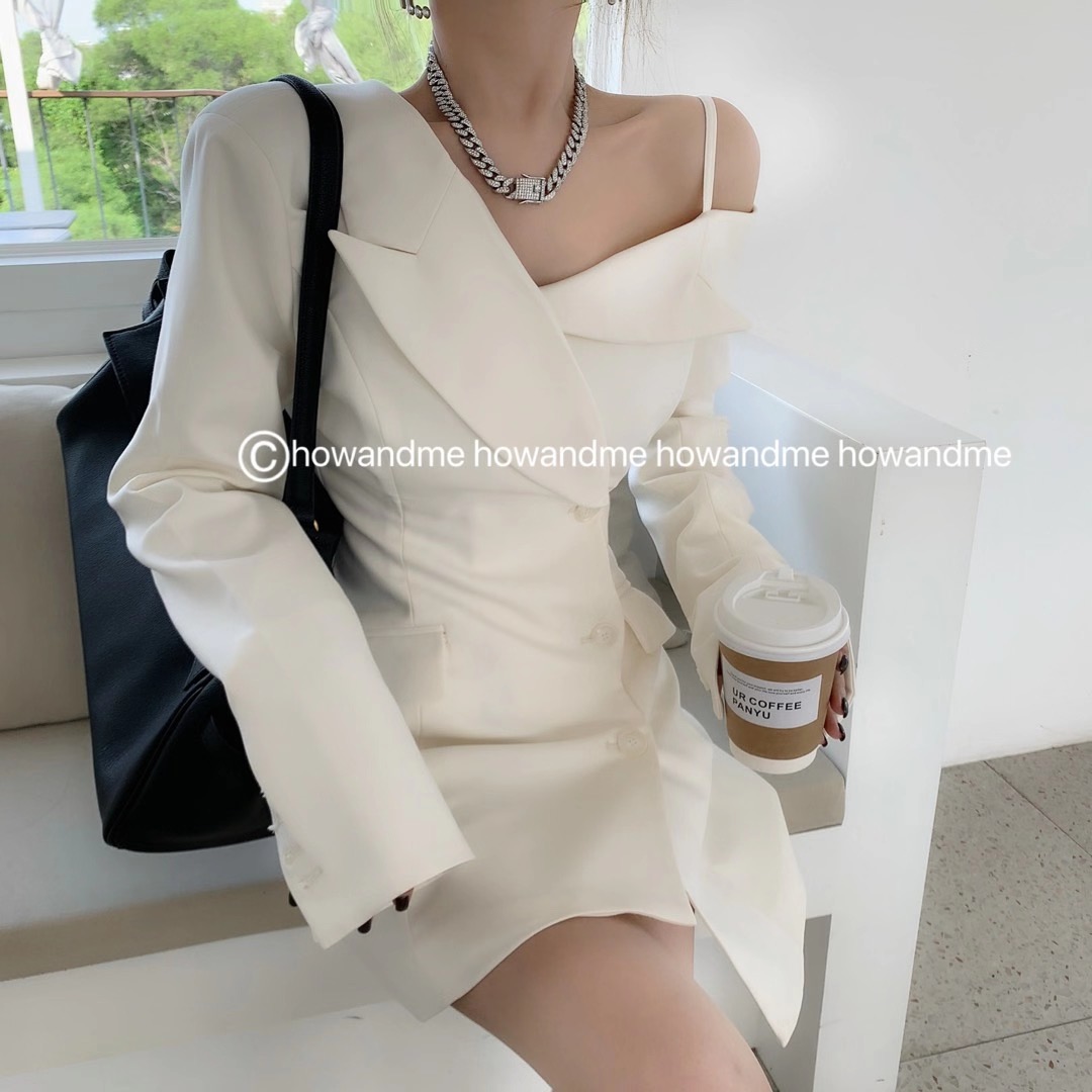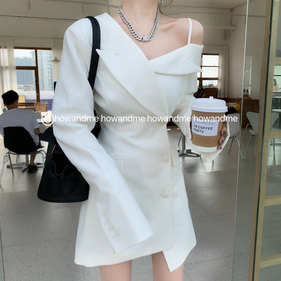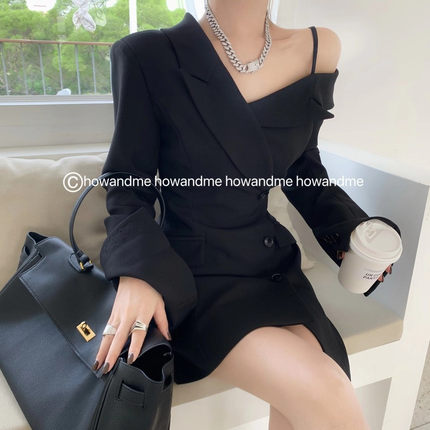 2025春季新款气质显瘦不对称露肩小众设计感长袖西装连衣裙短裙子