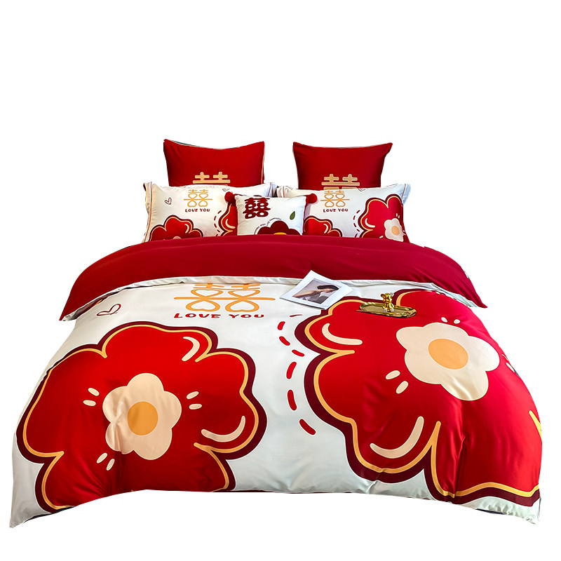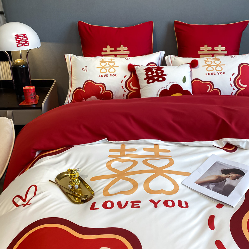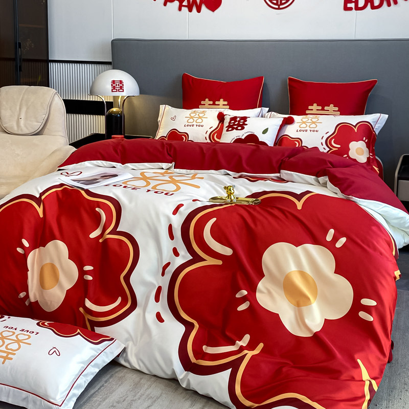 婚庆水洗棉四件套中式大红色床单高档刺绣非全棉被套结婚床上用品