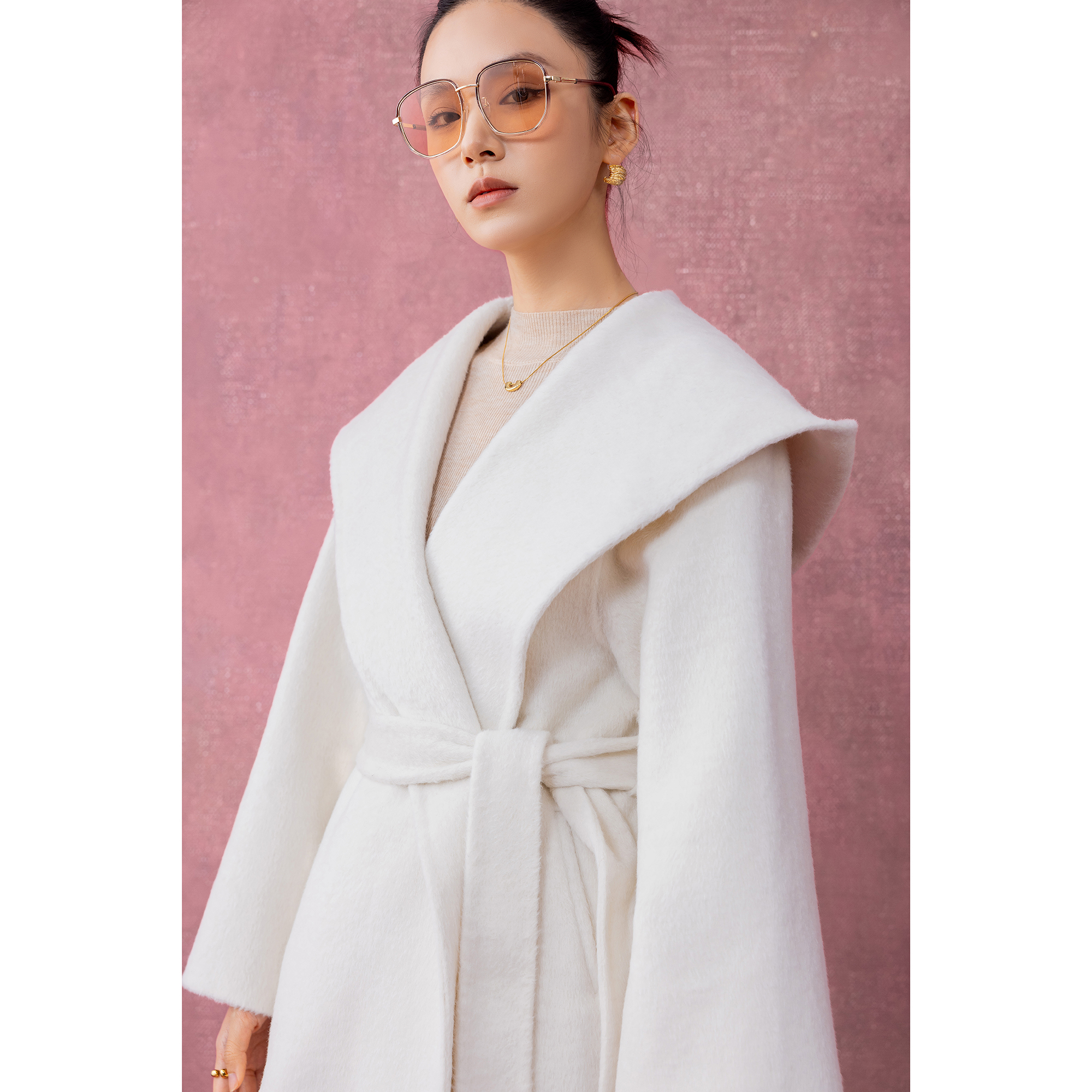 2025冬新款学院风连帽宽松羊毛呢外套女白色100澳毛双面羊绒大衣